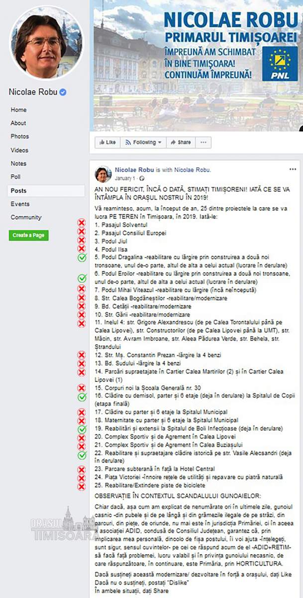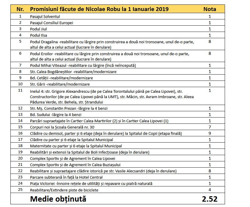 Redevenind serioși, dacă ar fi să notăm performanța profesorului Nicolae Robu la administrație locală, domnul Robu n-ar avea nici măcar notă de promovarea examenului (vezi poza de sub – subiectul fiind „lucrul pe teren” am notat cu notat 4 primul hârleț, cu nota 1 inexistența hârțelului), nota finală pentru executarea promisiunilor făcute de dânsul timișorenilor la 1 ianuarie 2019 fiind 2.52. Adică, Nicolae Robu ar rămâne corigent fără prea multe discuții.