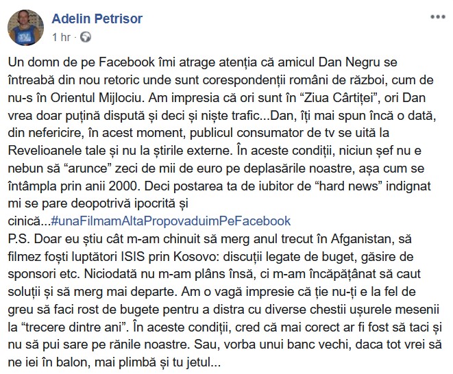„[..] Dan Negru se întreabă din nou retoric unde sunt corespondenții români de război, cum de nu-s în Orientul Mijlociu. Am impresia că ori sunt în “Ziua Cârtiței”, ori Dan vrea doar puțină dispută și deci și niște trafic…Dan, îți mai spun încă o dată, din nefericire, în acest moment, publicul consumator de tv se uită la Revelioanele tale și nu la știrile externe. În aceste condiții, niciun șef nu e nebun să “arunce” zeci de mii de euro pe deplasările noastre, așa cum se întâmpla prin anii 2000. Deci postarea ta de iubitor de “hard news” indignat mi se pare deopotrivă ipocrită și cinică…#unaFilmamAltaPropovaduimPeFacebook