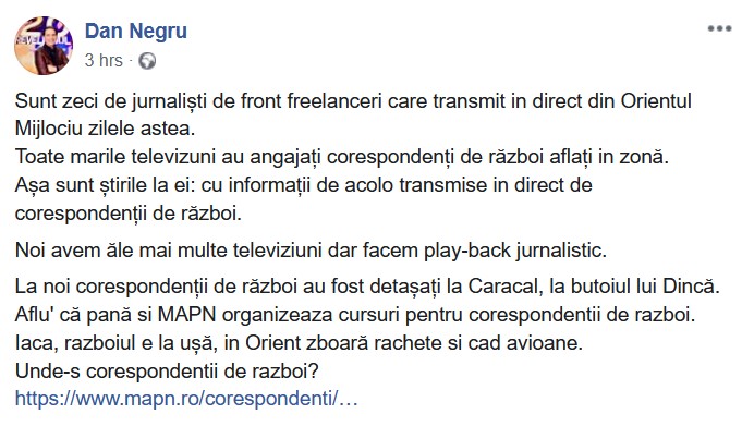 Într-o postare pe Facebook, timișoreanul Dan Negru se întreabă unde sunt corespondenții de război ai presei din România: „Sunt zeci de jurnaliști de front freelanceri care transmit in direct din Orientul Mijlociu zilele astea. Toate marile televizuni au angajați corespondenți de război aflați in zonă. Așa sunt știrile la ei: cu informații de acolo transmise in direct de corespondenții de război. Noi avem ăle mai multe televiziuni dar facem play-back jurnalistic. La noi corespondenții de război au fost detașați la Caracal, la butoiul lui Dincă. Aflu’ că pană si MAPN organizeaza cursuri pentru corespondentii de razboi. Iaca, razboiul e la ușă, in Orient zboară rachete si cad avioane. Unde-s corespondentii de razboi? ” se întreabă Dan Negru pe pagina sa de Facebook.