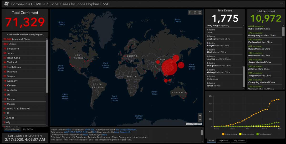 Până azi au murit cel putin 1,775 persoane în întreaga lume de la infecția cu virusul COVID-10 cunoscut popular sub numele de Coronavirus. Majoritatea persoanelor care au decedat în urma infecției cu Coronavirus sunt în China, în jurul metropolei Wuhan. Dar zilele trecute s-au înregistrat și decese în Franța, Japonia, Hong Kong, Taiwan și Filipine. În lume sunt în acest moment peste 71,500 de persoane diagnosticate cu Coronavirus, iar în Europa avem 16 persoane în Germania, 12 în Franța, 9 în Marea Britanie, 3 în Italia, câte două în Rusia și Spania și una în Belgia, Finlanda și Suedia.