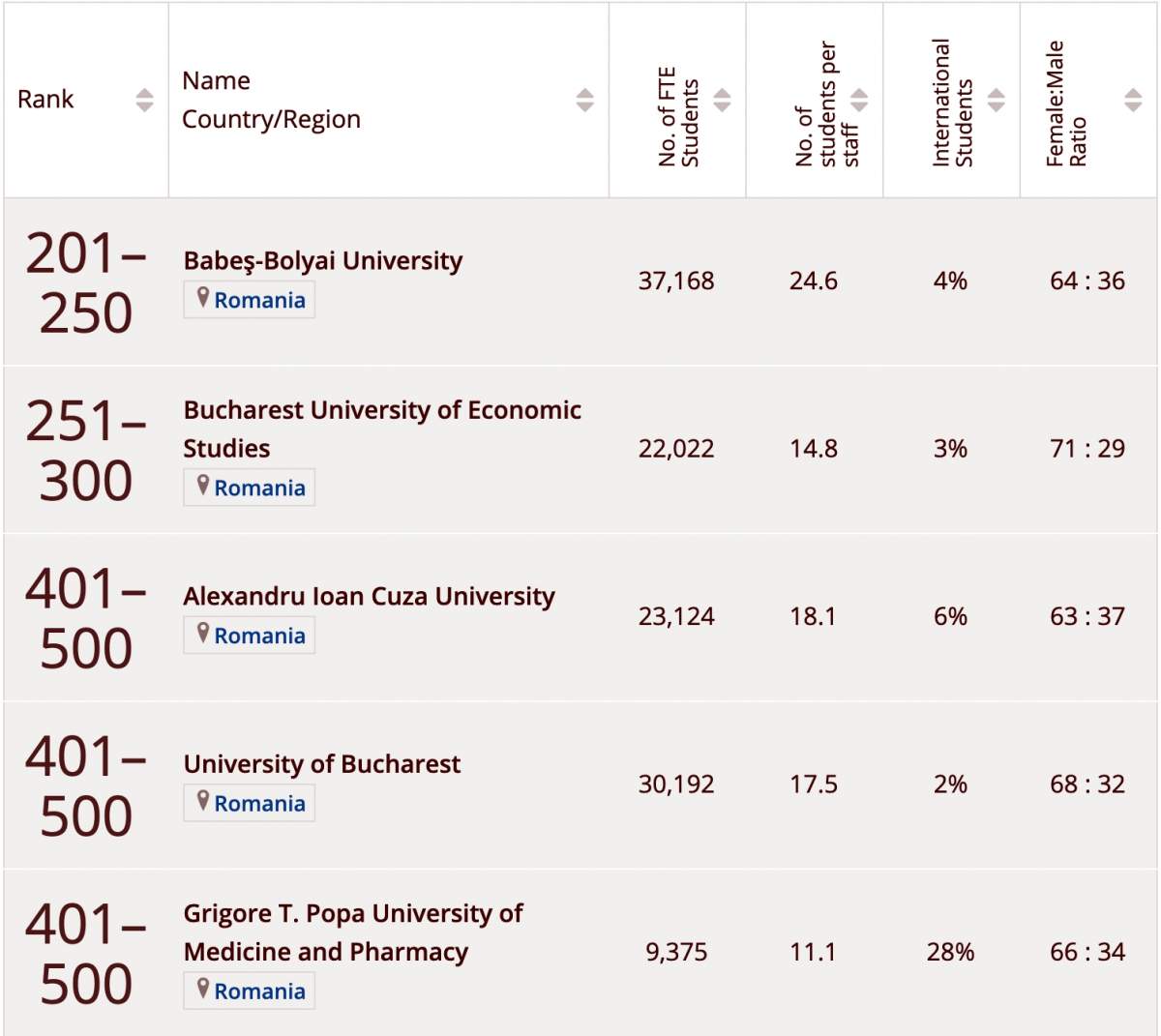 Următoarea clasată, Academia de Studii Economice București, ocupă un loc în intervalul 251-300. În intervalul 401-500 apar Universitatea A.I. Cuza, Universitatea din București, Universitatea de Medicină și Farmacie Grigore T. Popa, Universitatea Politehnică din București, Universitatea Tehnică din Cluj-Napoca, Universitatea de Vest din Timișoara. În segmentul 501+ apare Universitatea Politehnică din Timișoara.