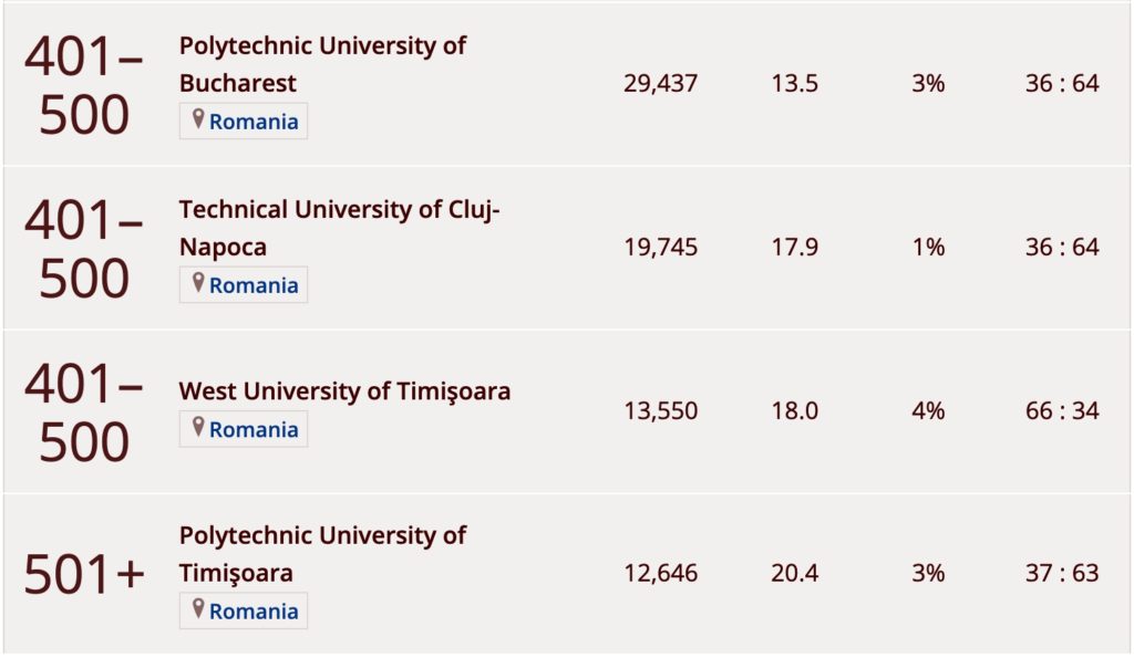 Conform clasamentului “Times Higher Education Emerging Economies University Rankings 2020” (THE 2020), Universitatea de Vest din Timișoara și Universitatea Politehnică din Timișoara se clasează după Universitățile din Cluj, Iași și București.
