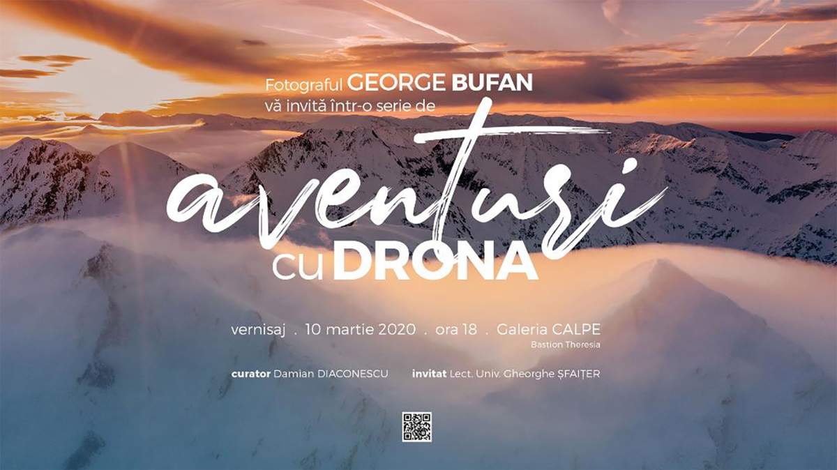 Vernisajul expoziției de fotografie „Aventuri cu drona”, de George Bufan, va avea loc marți, 10 martie, ora 18, la Galeria „Calpe” (str. Hector nr.4). Lucrările vor fi expuse până sâmbătă, 14 martie, intrarea fiind gratuita. Expozitia „Aventuri cu drona” este cu vanzare, lucrarile putand fi achizitionatela fata locului. In deschidere vernisajului vor lua cuvantul lectorul Gh. Șfaițer și curatorul Damian Diaconescu.