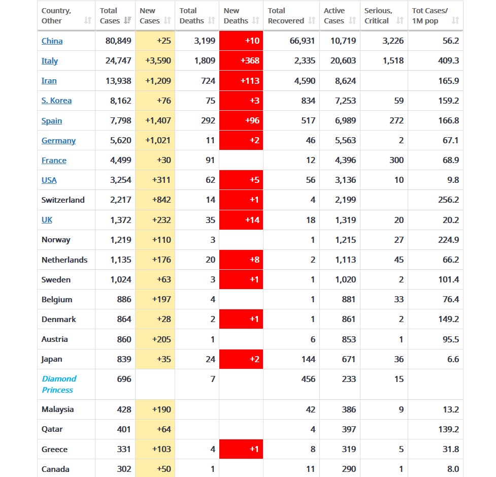 Italia a cunoscut azi cea mai neagră zi din istoria infecțiilor cu covid19. 368 de oameni și-au pierdut viața și 3.590 s-au îmbolnăvit.