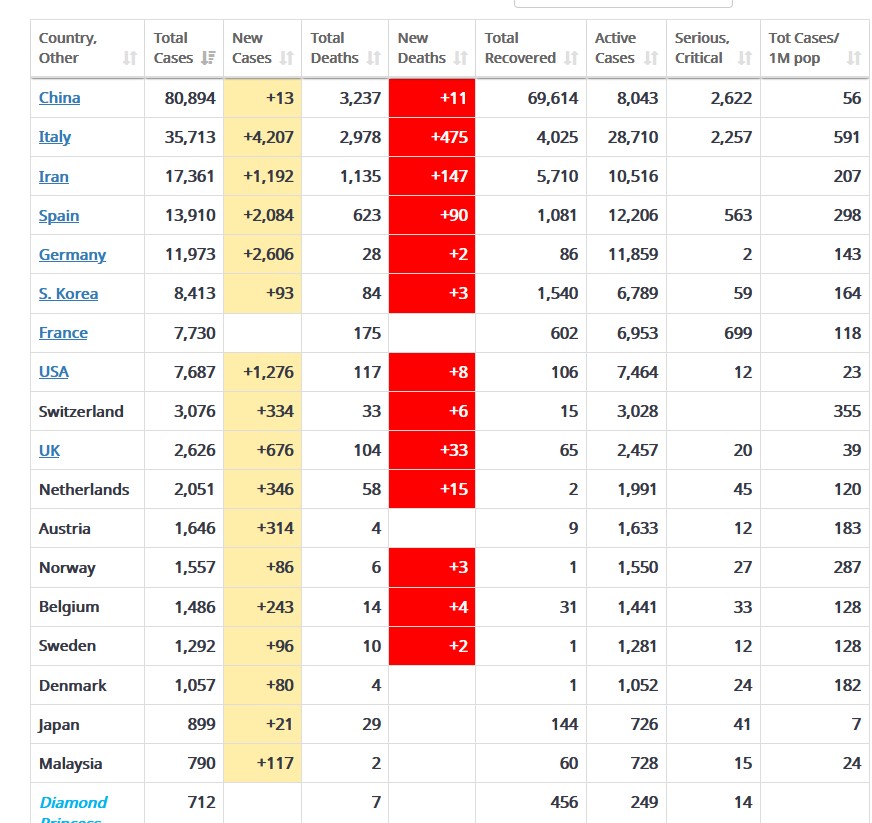 Cifrele totale ale coronavirusului în Italia arată devastator : peste 35.000 de persoane infectate și 2.978 de morți. Spre comparație, China în momentul de față are 3.237 morți dintr-un total de 80.894 persoane infectate cu covid19 (peste 69.000 de persoane sunt recuperate).