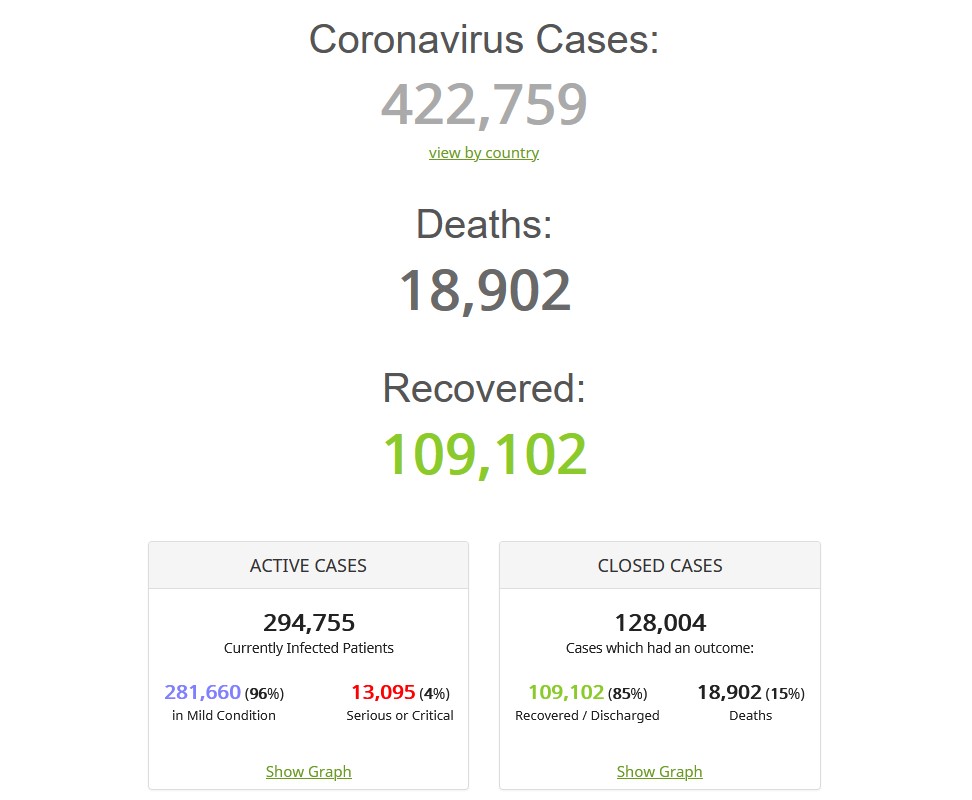 Mai mult de 400.000 de cazuri de coronavirus au fost confirmate oficial în întreaga lume de la începutul pandemiei. Cel puţin 422.759 de cazuri de infecţii, dintre care 18.902 decese, au fost înregistrate în 175 de ţări şi teritorii, în special în China (81.171 de cazuri, dintre care 3.277 morţi), focarul pandemiei, şi în Italia (69.176 de cazuri), cea mai grav afectată ţară, cu 6.828 de decese.