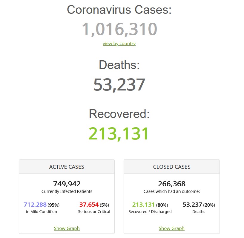 La nivel mondial nu stăm deloc bine: sunt peste un milion de cazuri de coronavirus și la ritmul în care se dezvoltă sunt toate șansele că în 10-12 zile să trecem de 2 sau 3 milioane. Avem și un record de 79.869 de cazuri noi de infectare cu coronavirus, dar și 213.131 cazuri de persoane vindecate, majoritatea provenind din China. Până acum în lume au murit de coronavirus 53.237 persoane și în stare critică în spitale sunt 37.654.