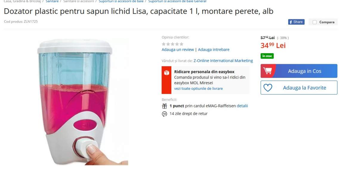2 . Un dozator de perete costă 34 lei (vezi poza 1). Negociat la cantitatea de 6.000 de bucăți, ar costa undeva la 23 lei probabil – rezultând un preț de 150.000 lei (cu comisionul aferent). Stocul e disponibil pe emag.ro în cantitatea cerută, importatorul mai are un tir din Turcia în vamă cu produse.