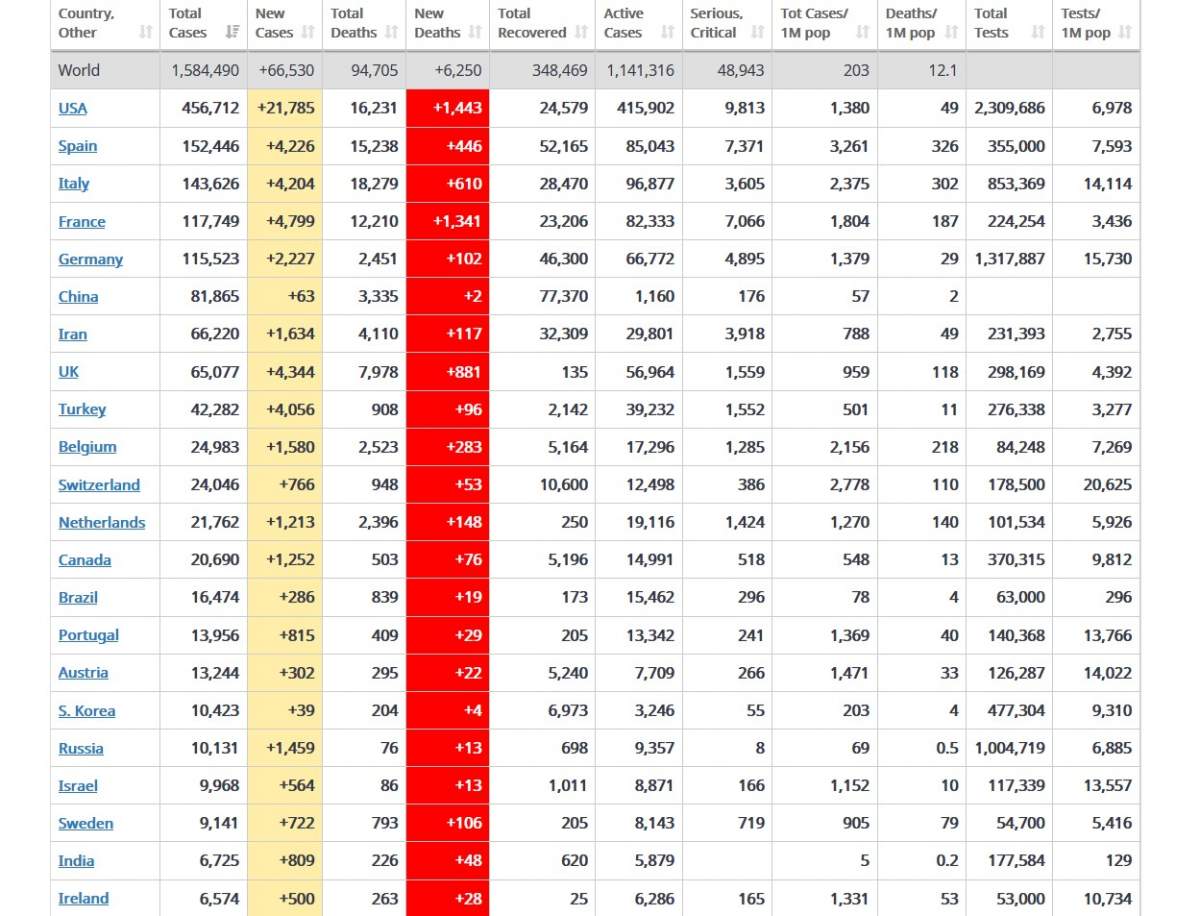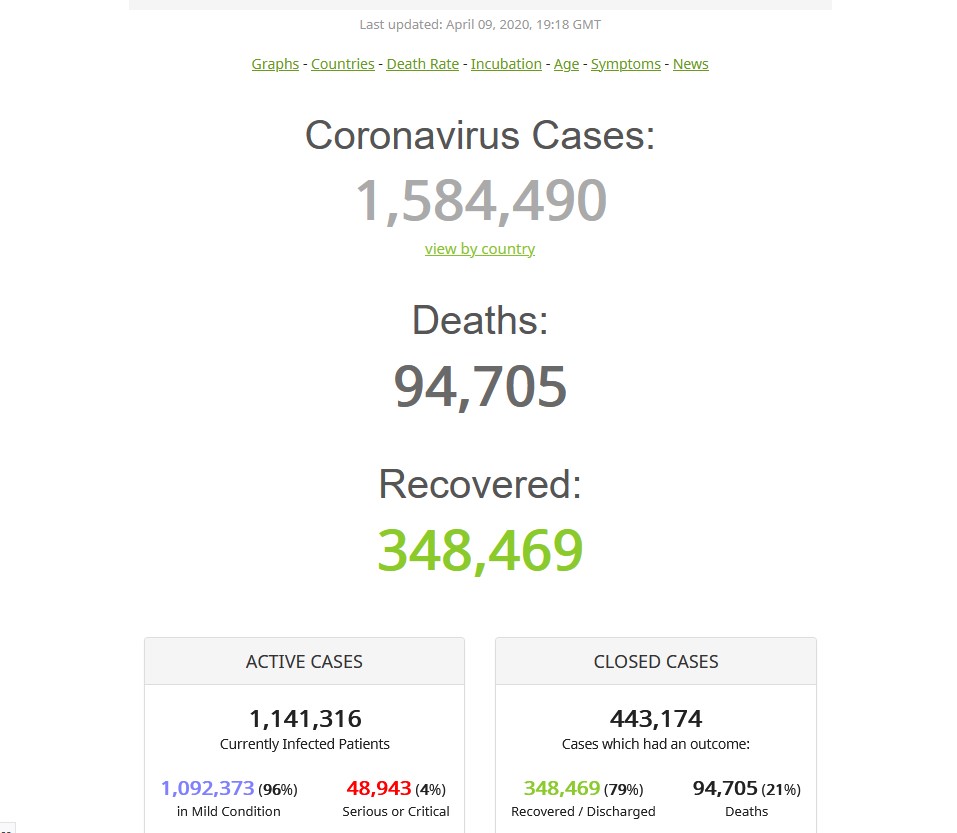 In intreaga lume sunt in acest moment peste 1,5 milioane de persoane infectaet si peste 94.000 de decese. Dintre acestea aproape 350.000 de persoane sunt considerate vindecate si aproape 50.000 de persoane sunt la terapie intensiva.