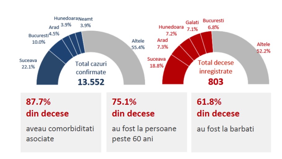 – 45% din totalul deceselor au fost înregistrate în Suceava, Galați, București, Mureș și Arad.