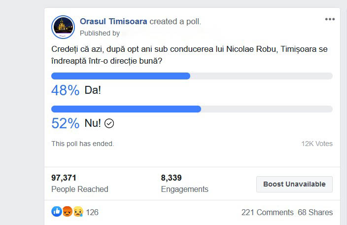 Ceea ce rezultă din sondaj dar și din comentarii este lipsa unui management eficient al orașului deși titlurile pompoase puse în fața numelui lui Nicolae Robu – doctor profesor inginer doctor honoris causa – ar trebui să dea un sens și părții de management eifcient și bun, dar nu o face (vă aducem aminte doar de mizeria sub care a lăsat primarul Robu orașul în 2018 când timp de 8 luni nu am avut contract de salubrizare stradală, lipsa unui PUG, a unui PUZ, lipsa aproape totală a investițiilor în Timișoara, transportul în comun deficitar, murdar și învechit, lipsa unei alternative pentru bicicliști, lipsa unui plan turistic și cultural – deși Timișoara va fi Capitală Europeană a Culturii în 2023 -, lipsa curentului pe străzile orașului – deși Timișoara a fost primul oraș iluminat electric din Europa- și multe multe altele). Banii bugetului local, deși în mandatele Robu Timișoara a avut an după an bugete record, par a fi risipiți pe lucruri inutile, servicii și lucrări plătite la suprapret.