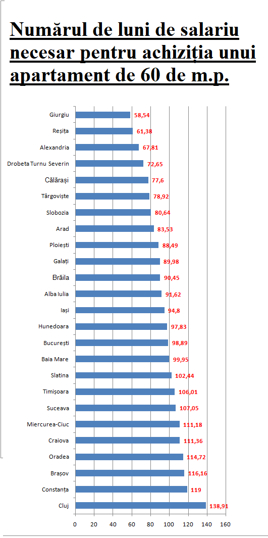 În funcție de salariul mediu net, cei de la Hotnews au făcut un top al celor mai scumpe orașe, din punctul de vedere al lunilor muncite pentru a cumpăra un apartament. Deși nu se află în primele cinci locuri, Timișoara ocupă totuși un loc în top 10, înaintea Bucureștiului și Iașiului. Asftel, unui timișorean, dacă ar strânge tot salariul câștigat lună de lună, i-ar trebui 106 luni pentru a cumpăra în Timișoara un apartament de 60 de metri pătrați, adică aproape 9 ani de zile. Presupunând prin absurd că nu ar cheltui niciun ban și prețurile dar și moneda nu ar cunoaște fluctuații. Pe prima poziție se află Clujul, unde pentru a cumpăra același apartament de 60 mp un angajat pe salariul mediu net ar trebui să îl strângă timp de 138 de luni, adică 13,5 ani.