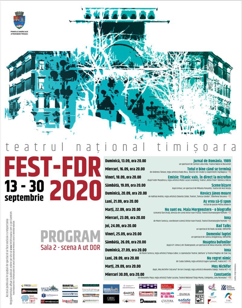 Duminică, 13 septembrie, începe o nouă ediție a Festivalului European al Spectacolului Timișoara – Festival al Dramaturgiei Românești. FEST-FDR – S.O.S.2020 devine, timp de două săptămâni, o nouă poartă pe care Teatrul Național o deschide spiritului, prin întâlnirea dintre oameni, dintre mințile și sufletele lor, în spațiul fizic al spectacolului de teatru, ca și în cel de dincolo de cuvânt.