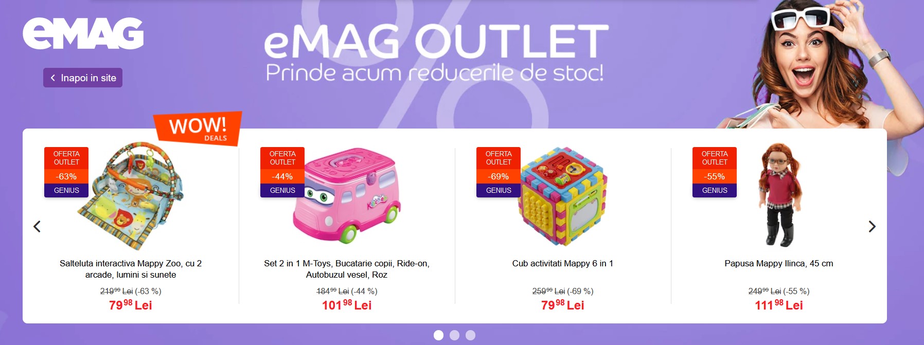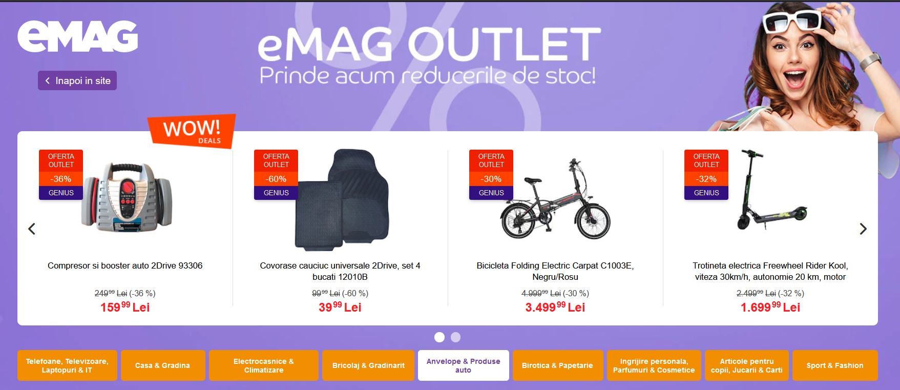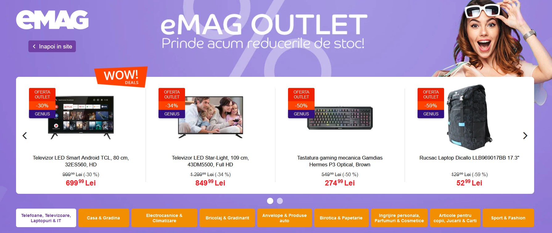 Emag.ro vine azi cu o oferta de reduceri de pana la 70% la unele produse din stoc: poti gasi de exemplu, in sectiunea TV televizoare cu diagonala de 80cm la 699 lei iar la 849 poti gasi televizoarele de 109 cm.
