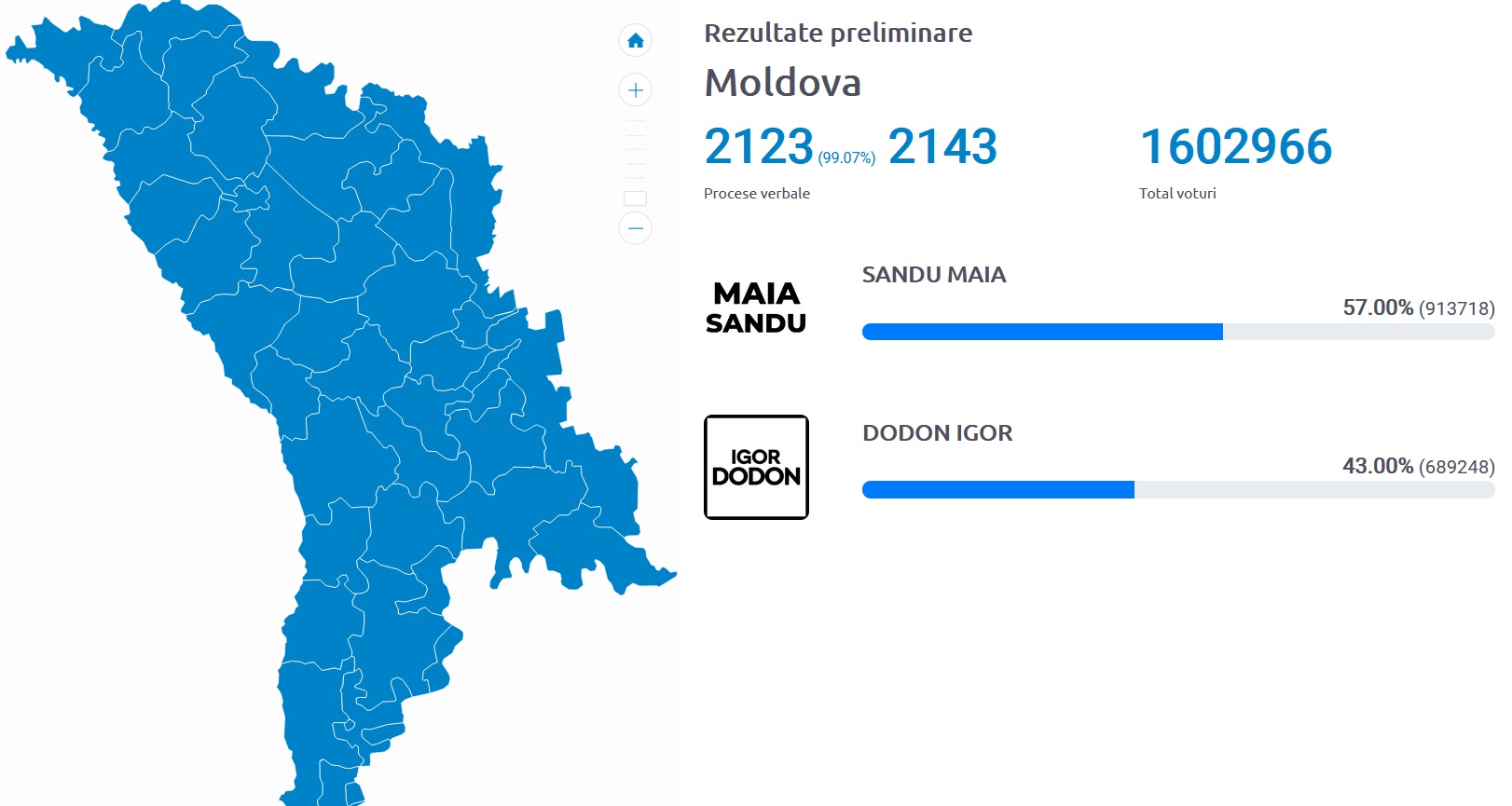 Datele centralizate de Comisia Electorală Centrală de la Chișinău după numărarea a peste 99% din voturi (2.123 din totalul de 2.143 de secţii de votare) arată că Maia Sandu a fost votată de 57% dintre alegători (913.718 de voturi), în timp ce contracandidatul său Igor Dodon a fost votat de 43% (689.248 de alegători).