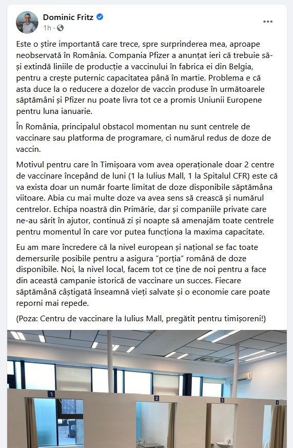 Eu am mare încredere că la nivel european și național se fac toate demersurile posibile pentru a asigura ”porția” română de doze disponibile. Noi, la nivel local, facem tot ce ține de noi pentru a face din această campanie istorică de vaccinare un succes. Fiecare săptămână câștigată înseamnă vieți salvate și o economie care poate reporni mai repede. ” încheie Dominic Fritz, primarul Timișoarei, expunerea motivelor pentru care Timișoara are doar două centre de vaccinare. Spre comparație, Clujul, un oraș de aceiași anvergură și populație cu Timișoara are opt centre de vaccinare.