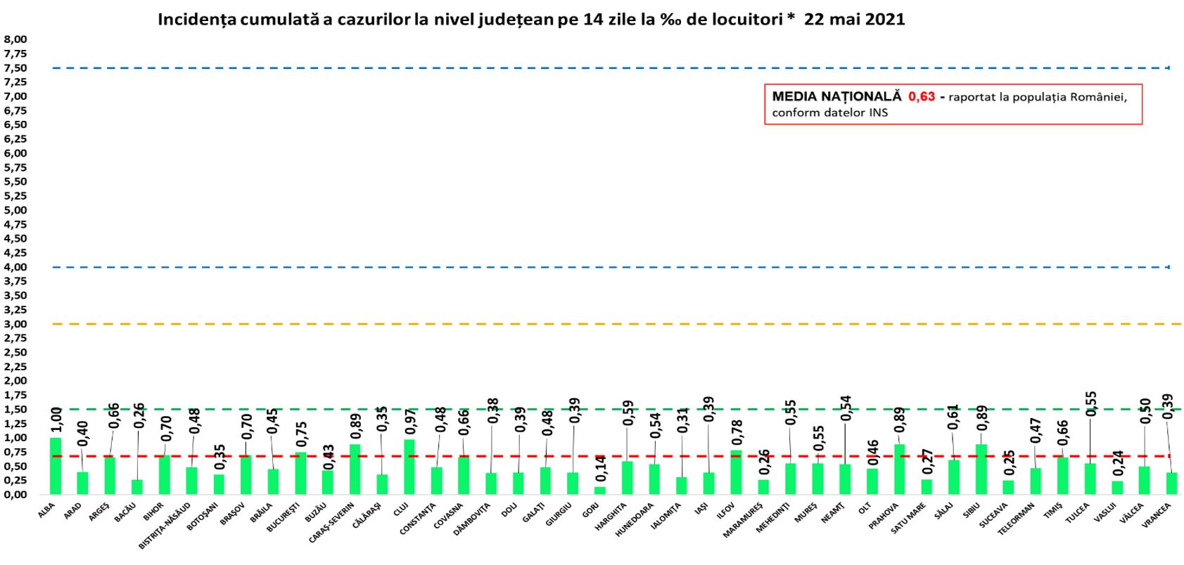 Niciun județ nu mai are rata de infectare mai mare de 1 la mie, iar media națională a incidenței cazurilor de coronavirus a coborât la 0,63, potrivit datelor furnizate sâmbătă de autorități.