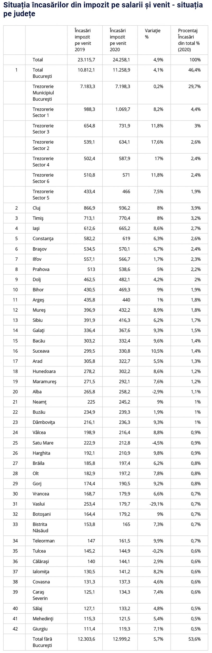 Aproape jumătate din suma încasată la bugetul de stat din impozit pe salarii și venit este colectată în București, potrivit datelor ANAF. Astfel, 11,26 miliarde de lei, reprezentând 46,4% din suma totală de 24,26 miliarde lei, a fost strânsă de stat anul trecut în București. Următoarele surse de încasări sunt județul Cluj – 936,2 milioane lei (3,9% din total), Timiș – 770,4 milioane lei (3,2%), Iași – 665,2 milioane lei (2,7%) și Constanța – 619 milioane lei (2,6%).