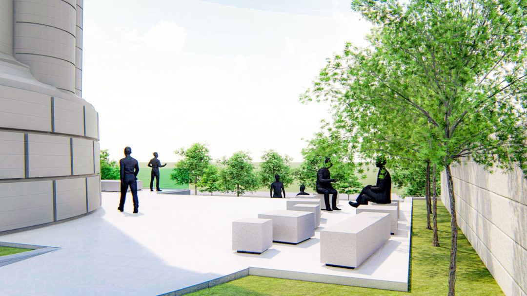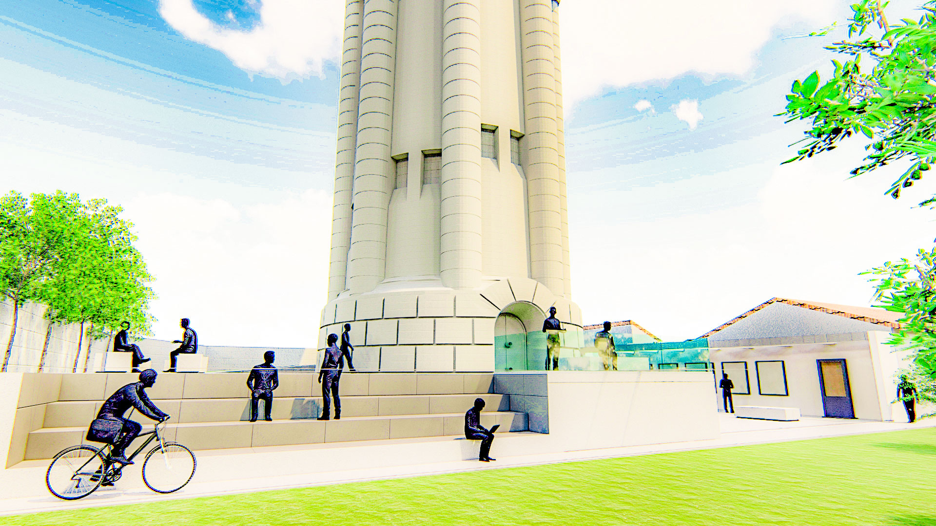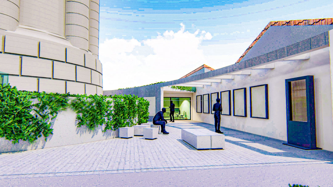 - amenajarea exterioară ce presupune o rampă de acces către turn și amplasarea unei mici construcții (birou administrativ și grupuri sanitare), care împreună să constituie un aparat complex de intrare. Accesul în turn este tratat ca un traseu pentru observarea construcției din exterior și care poate fi folosit ca spațiu expozițional. Se va demola gardul existent, se va amenaja terenul cu rampă de acces, se vor realiza gradene de beton si o copertină;