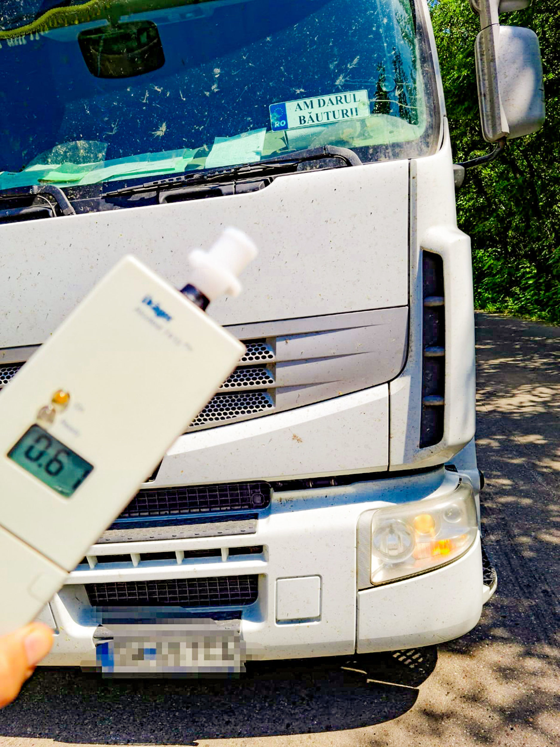 Si daca tot zice ca are „darul băuturii” (vezi plăcuța din parbriz), polițiștii rutieri au hotărât să-l testeze, iar rezultatul a fost pe măsură, respectiv 0,61 mg/l alcool pur în aerul expirat.