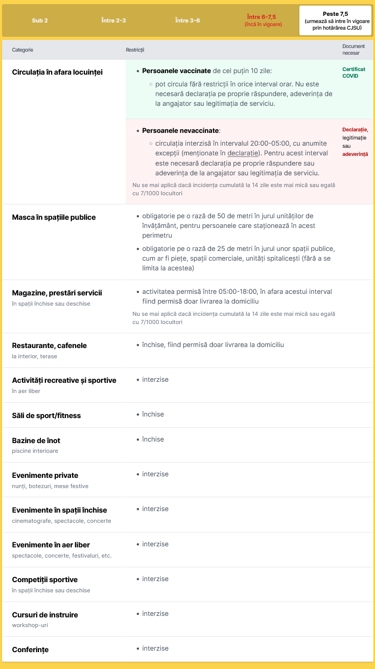 Pentru persoanele nevaccinate circulația este interzisă în intervalul 20:00-05:00, cu anumite excepții (menționate în declarație). Pentru acest interval este necesară declarația pe proprie răspundere sau adeverința de la angajator sau legitimația de serviciu.