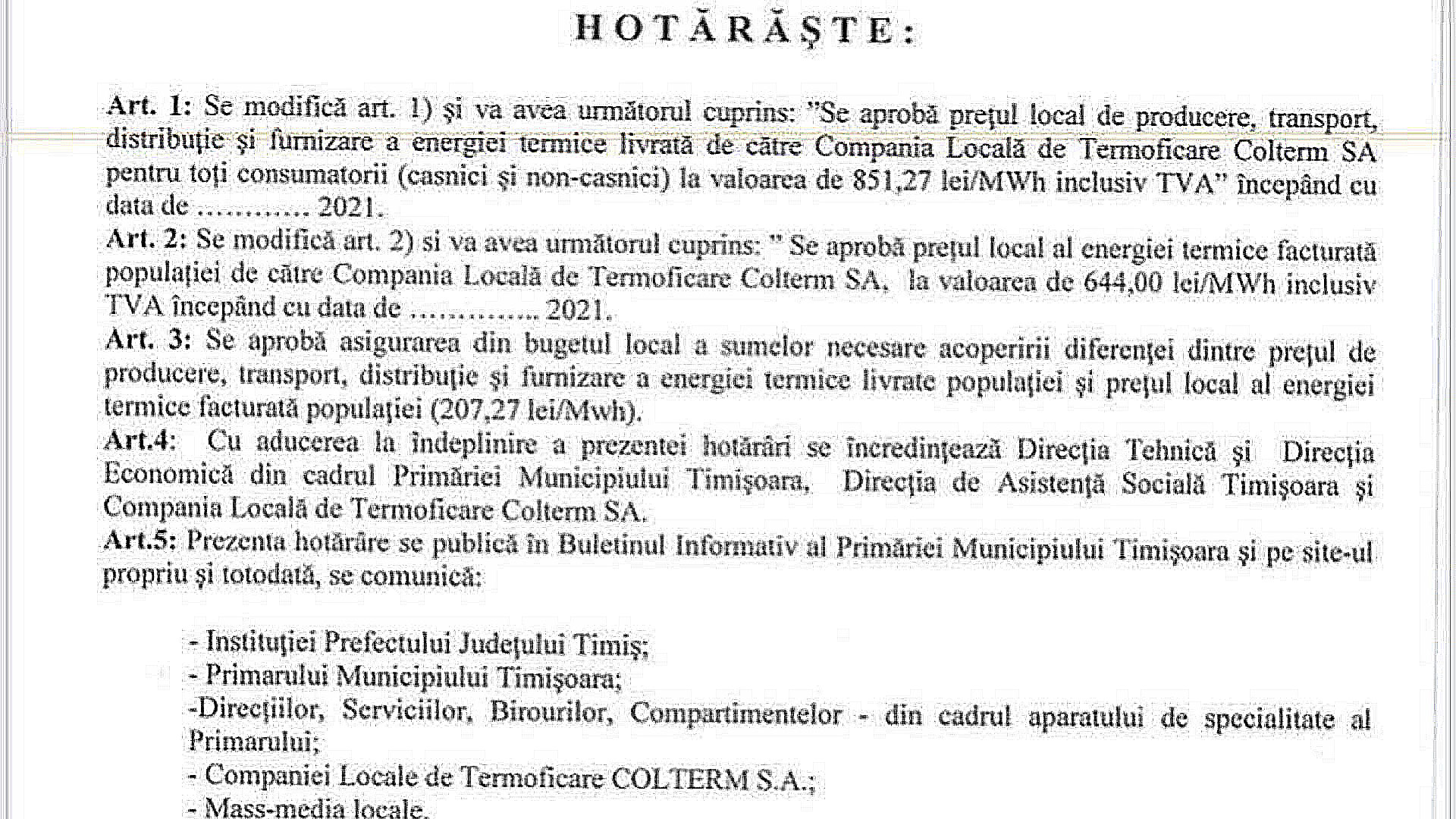 „Pe ordinea de zi a plenului de marți va fi introdus un proiect de hotărâre privind stabilirea noului preț la gigacalorie. Acesta va crește de la 480 de lei la 851 de lei. Dramatică și peste pragul de suportabilitate a multor timișoreni prizonieri ai sistemului de încălzire centralizat este creșterea de 2,7 ori a prețului la factura directă, de la 240 de lei la 644 de lei! Subvenția acordată de la bugetul local scade de la 240 de lei la 207 lei!