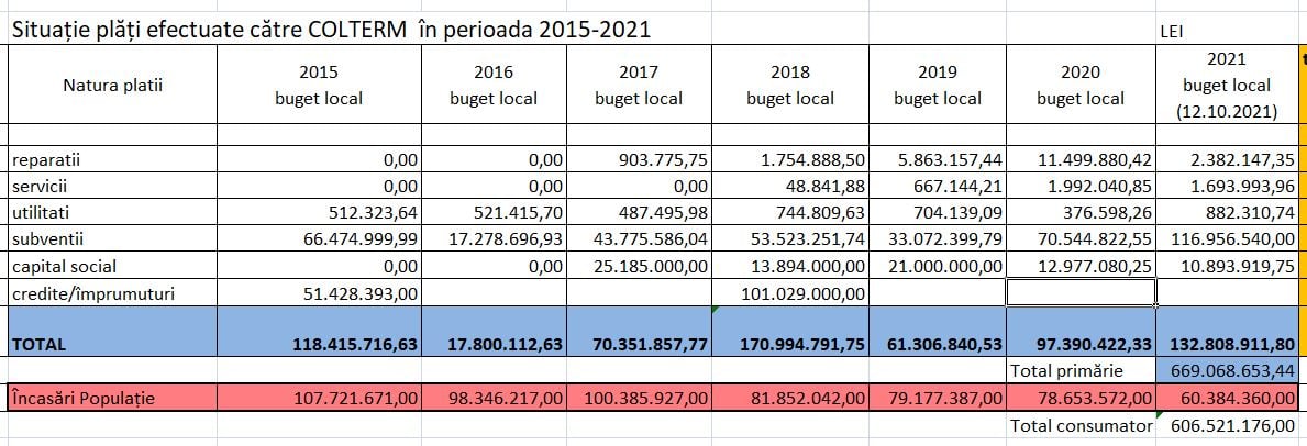 De la an la an numărul de abonați a scăzut, cu ei scăzând și încasările societății. Colterm a ajuns de la încasări de 150 de milioane de lei de la consumatori, în 2012, la încasări de 78 de milioane anul trecut. De la an la an pierderile tehnologice, din cauza lipsei de investiții în rețele, a crescut, vorbim de pierderi de peste 200 de milioane, bani ce s-au scurs literalmente în pământ.