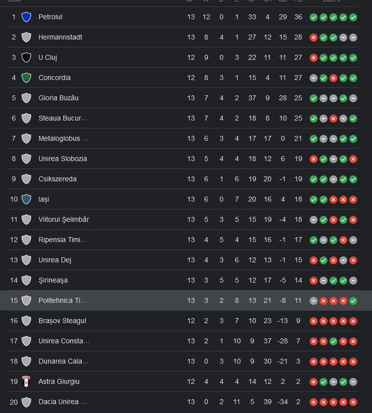 Politehnica a rămas pe locul 15, cu 11 puncte. Următorul joc la nivelul Ligii 2 va fi pe terenul celor de la FC Braşov.