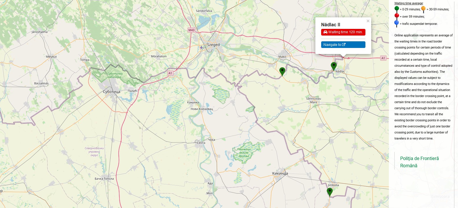Potrivit aplicaţiei online de monitorizare a timpilor de aşteptare la graniţe, de pe site-ul Poliţiei de Frontieră, la PTF Nădlac II sunt deschise trei artere de ieşire şi trei de intrare în ţară pentru traficul uşor, dar se întregistrează un „număr mare de autoturisme prezente la verificările de frontieră” şi „lipsă de personal din partea autorităţilor de frontieră maghiare”.