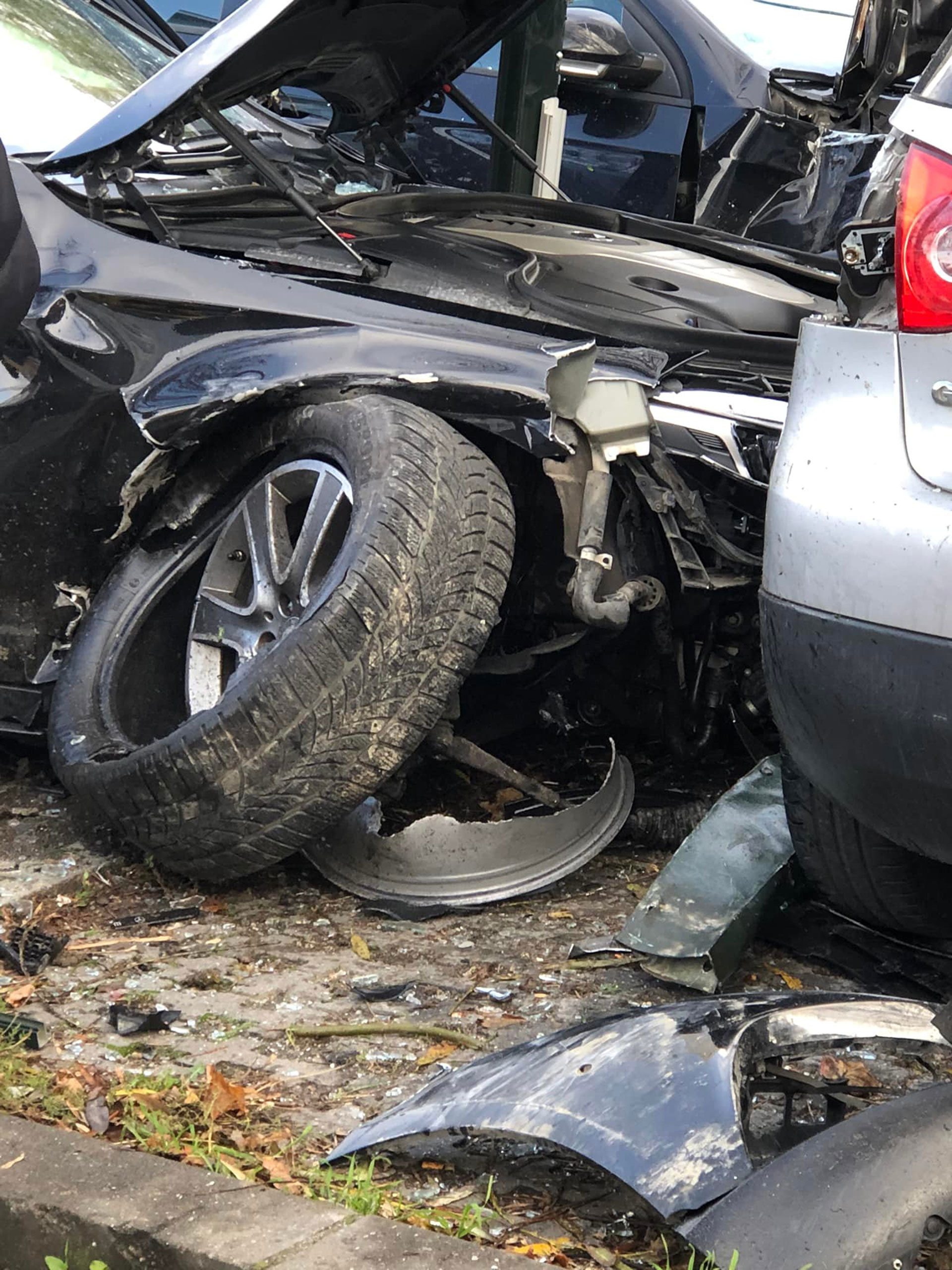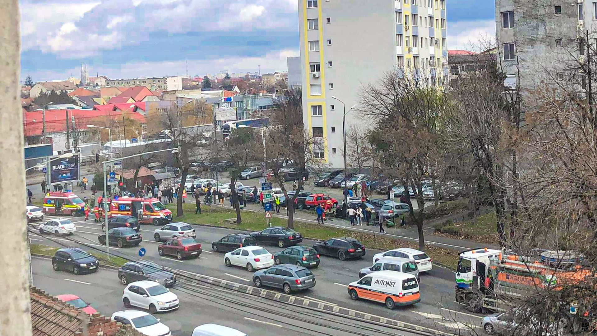 În urma impactului primul autoturism a fost proiectat în doi pietoni, un bărbat și o femeie, ambii in vârstă de 68 de ani, care traversau regulamentar, iar ulterior autoturismul, scăpat de sub control, a intrat în coliziune cu alte 4 autoturisme ce se aflau într-o parcare special amenajată.