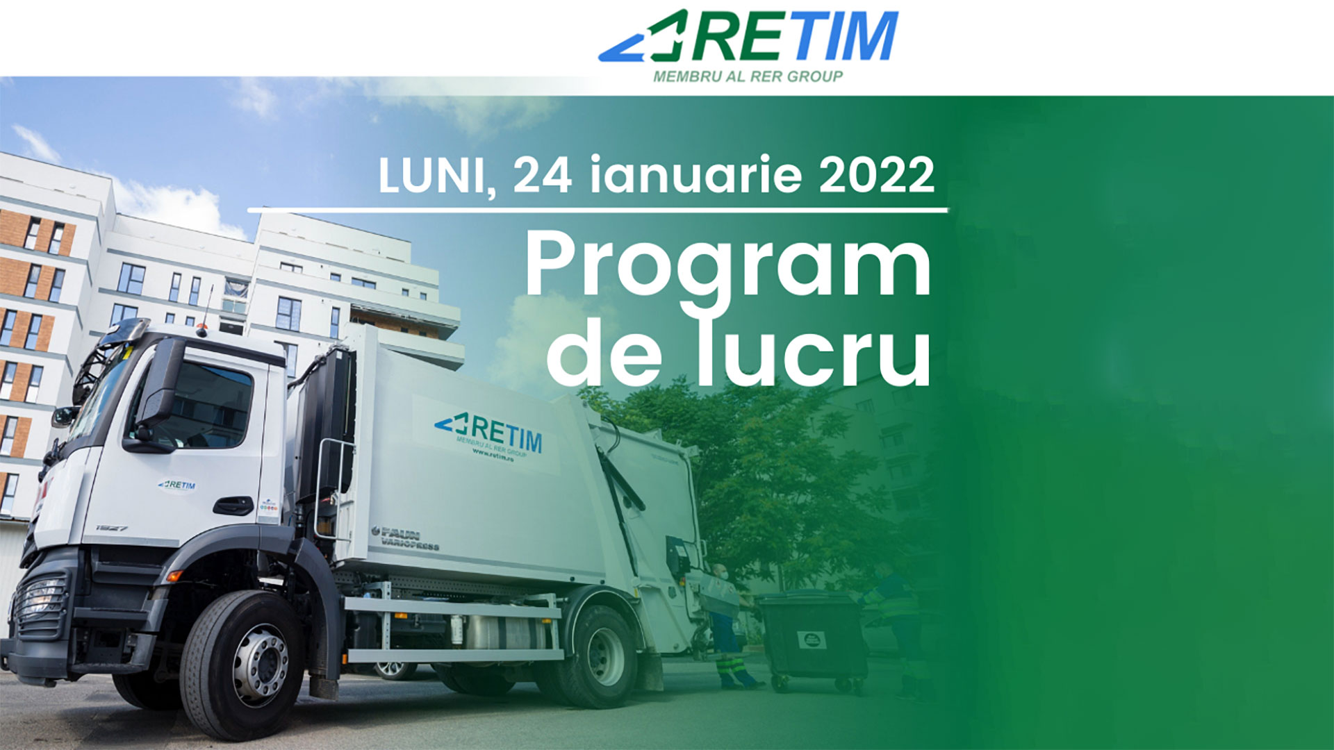 Activitatea de colectare a deşeurilor din toate localităţile din județul Timiș în care operează compania RETIM se va desfăşura la fel ca într-o ZI OBIȘNUITĂ. Astfel, dacă în ziua de luni, 24 ianuarie 2022, erau programate colectări de la adrese, acestea se vor face ca de obicei, compania RETIM asigurând permanența serviciului. Utilizatorii serviciului de salubrizare sunt rugați să scoată la stradă recipientele de colectare a deșeurilor, ca de obicei.