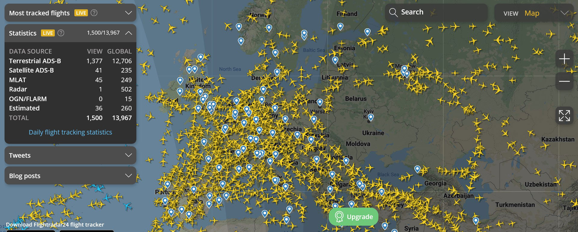 Imaginile de la flightradar24.com nu arată nicio aeronavă deasupra Ucrainei, cu mențiunea că site nu poate afișa date de urmărire de la aeronavele care operează în zonă cu difuzarea locației oprită în mod intenționat. Zborurile civile peste Ucraina, precum și Moldova spre sud și părți ale Rusiei sunt în prezent restricționate. O notificare adresată piloților avertizează: „Spațiul aerian al Ucrainei a fost închis pentru zborurile aviației civile din cauza invaziei militare a Federației Ruse”. Agenția pentru Siguranța Aviației a Uniunii Europene a avertizat joi că „prezența și posibila utilizare a unei game largi de sisteme de război terestre și aeriene prezintă un risc MARE pentru zborurile civile care operează la toate altitudinile și nivelurile de zbor”.