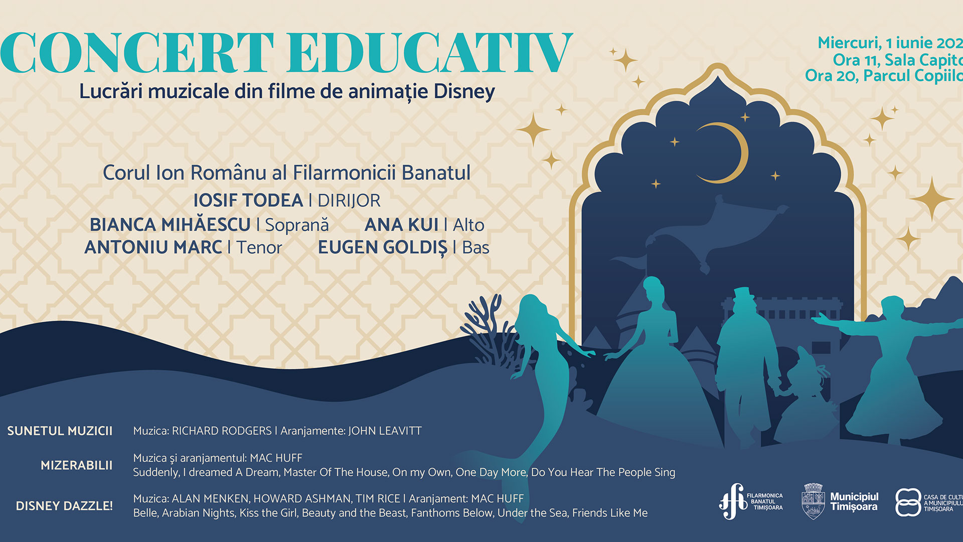 Astfel, prima întâlnire muzicală propusă este miercuri, 1 iunie, de la ora 11, la Sala Capitol, unde Corul Ion Românu al Filarmonicii Banatul, sub conducerea maestrului Iosif Todea, alături de Bianca Mihăescu (soprană), Ana Kui (Alto), Antoniu Marc (tenor) și Eugen Goldiș (bas) va interpreta lucrări muzicale din filme de animație Disney.