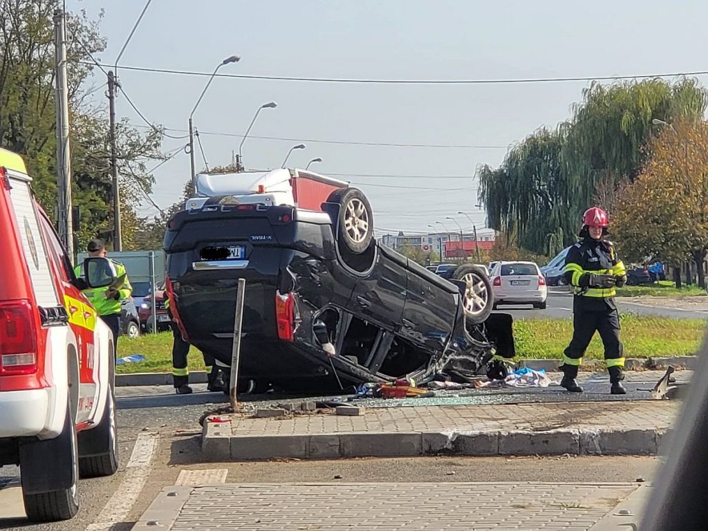 Un bărbat a pierdut controlul volanului și s-a răsturnat într-un sens giratoriu din Timișoara