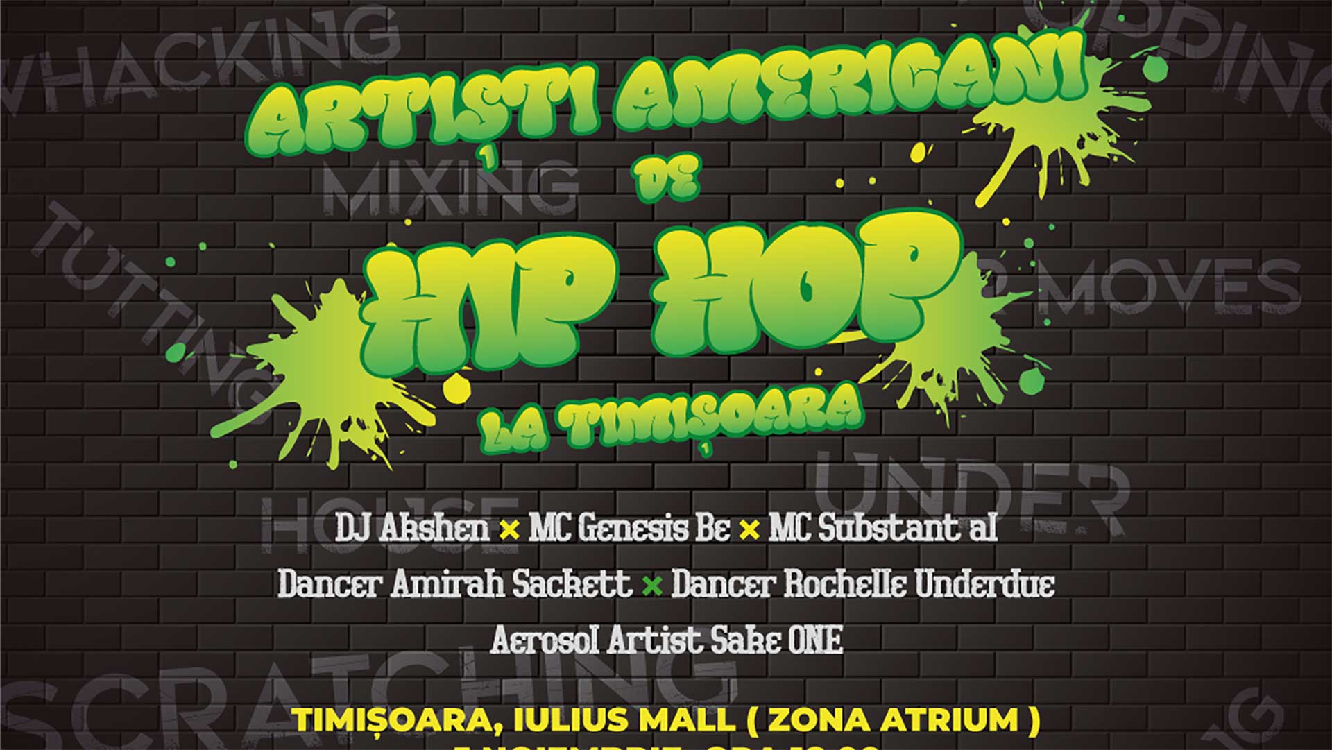 The Two-Step, The Monestary, The Billy Bounce, The Woah sunt câteva dintre mișcările pe care le veți putea vedea și chiar învăța sâmbătă, 5 noiembrie 2022, la evenimentul Artiști americani de Hip Hop la Timișoara. DJ Aksen, MC Substantial, MC Genesis Be, Dancer Amirah Sackett, Dancer Rochelle Underdue și Aerosol/Graffiti/Tatoo artist Sake ONE sunt invitații speciali, care au susținut mai multe workshop-uri pentru tinerii talentați din Timișoara. Aceștia vor cuceri prin dans Atriumul Iulius Town, începând cu ora 18.00. Evenimentul este organizat de Ambasada Statelor Unite ale Americii (SUA). După reprezentația din Timișoara, evenimentul se va repeta în Capitală, alături de tineri bucureșteni, iar la final, doi reprezentanți din cele două orașe vor merge în SUA pentru a participa la un program intens de training alături de specialiști din industrie.