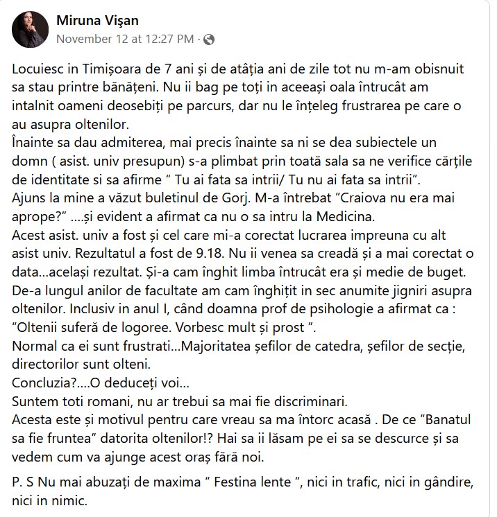 „De-a lungul anilor de facultate am cam înghițit în sec anumite jigniri asupra oltenilor. Inclusiv în anul I, când doamna profesor de psihologie a afirmat că: «Oltenii suferă de logoree. Vorbesc mult și prost». Normal că ei sunt frustrați…Majoritatea șefilor de catedră, șefilor de secție, directorilor sunt olteni. Concluzia?….O deduceți voi…Suntem toți români, nu ar trebui să mai fie discriminări. Acesta este și motivul pentru care vreau să mă întorc acasă. De ce «Banatul sa fie fruntea» datorită oltenilor!? Hai sa îi lăsam pe ei să se descurce și să vedem cum va ajunge acest oraș fără noi“.