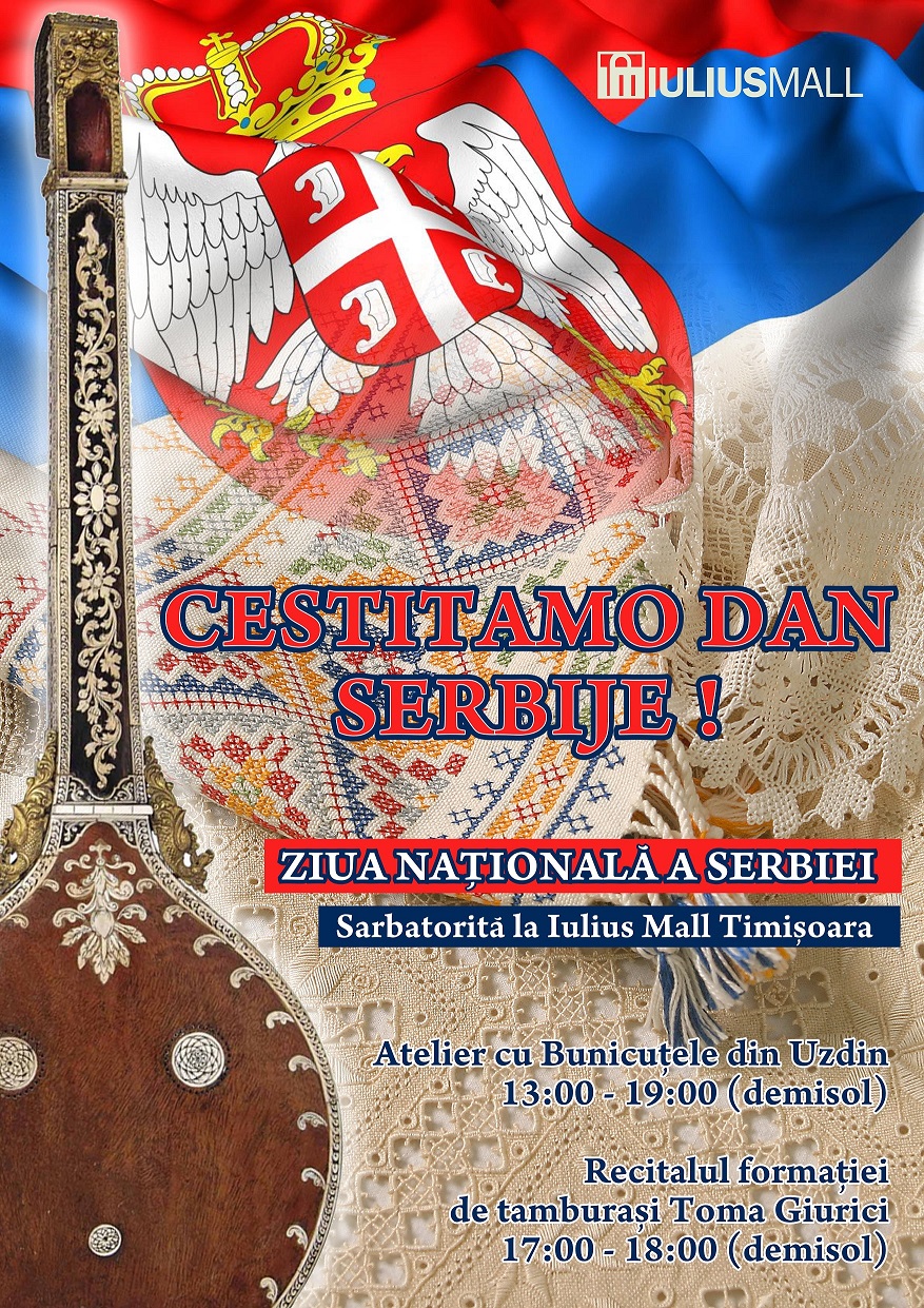 Persoanele care doresc să afle mai multe despre tradiţiile altor popoare sunt invitate, în weekend, la o serie de evenimente dedicate Zilei Serbiei, sărbătorită în fiecare an pe data de 15 februarie. Programate sâmbătă, 13 februarie 2016, manifestările se adresează timişorenilor de etnie sârbă, celor care îndrăgesc obiceiurile vecinilor de peste graniţă, dar şi turiştilor din Serbia care vizitează mall-ul.