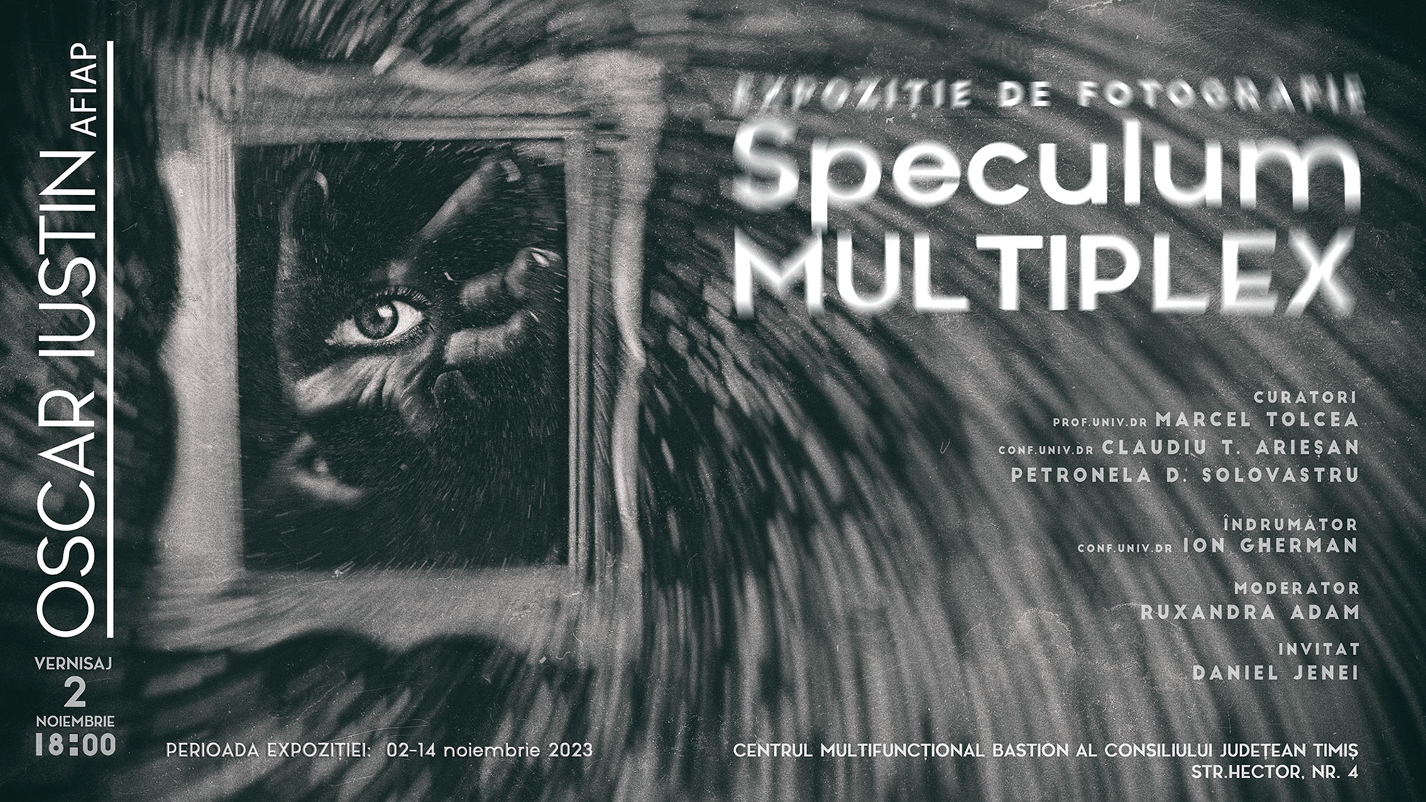 Vă invităm să descoperiți expoziția multi-manifest ”SPECULUM MULTIPLEX de Oscar Iustin”, un eveniment multi-cultural cu momente artistice inedite, deschisă publicului în perioada 2 – 14 noiembrie 2023. Vernisajul din data de 2 noiembrie 2023 începând cu orele 18:00 este organizat la Centrul Multifuncțional Bastion al Consiliului Județean Timiș, Str. Hector, nr. 4, Timișoara.