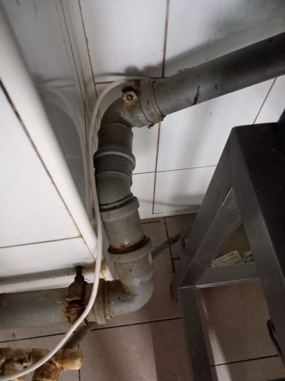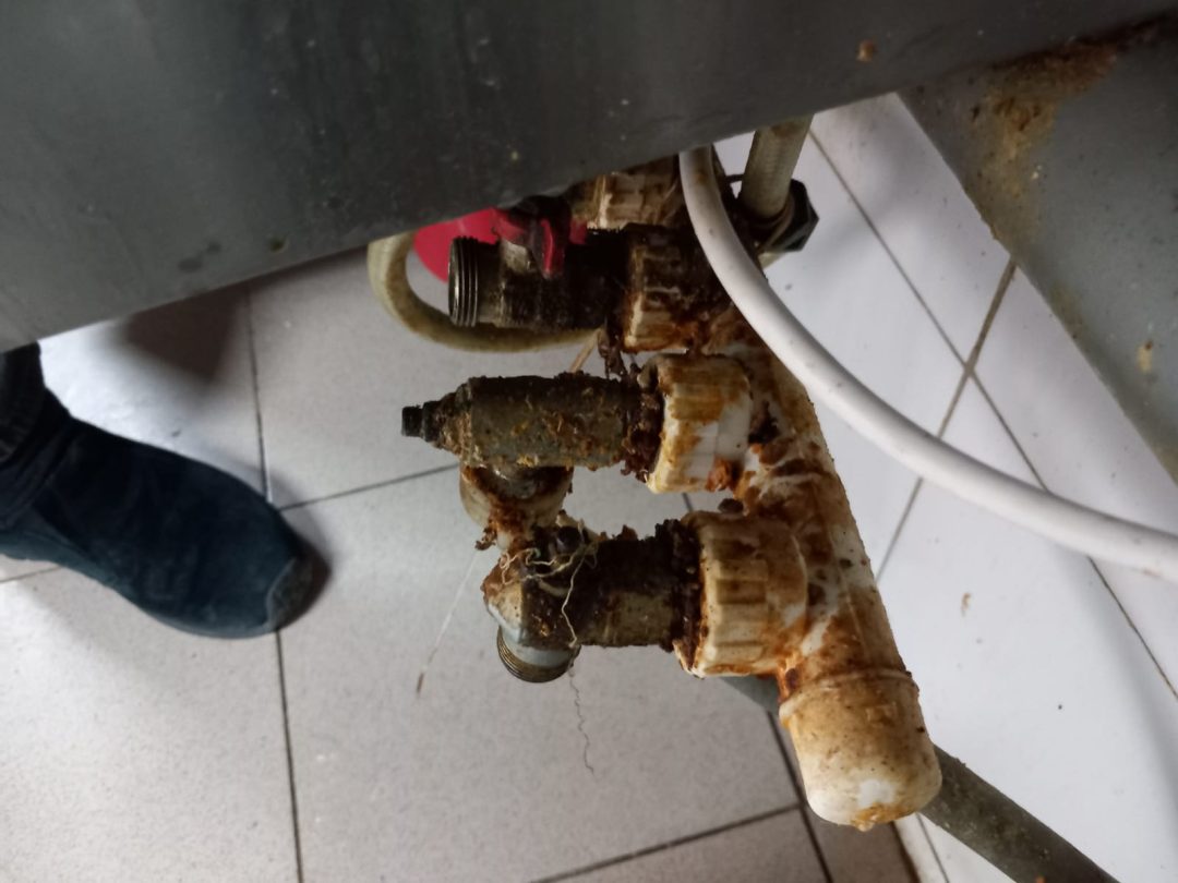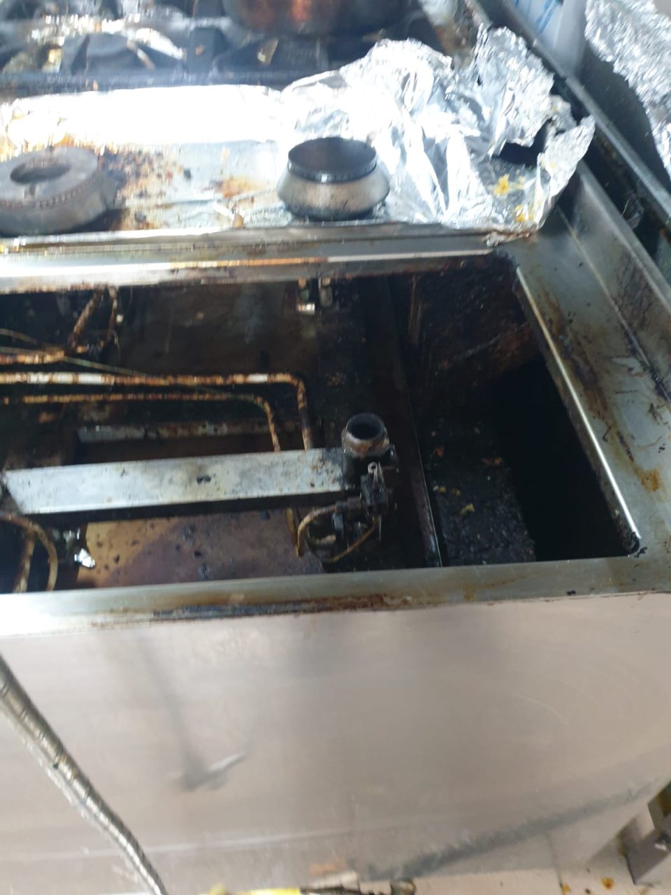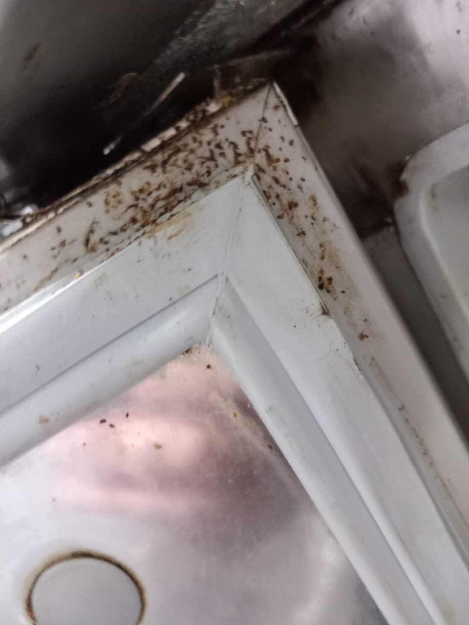 -Aragaz, tigăi, oale neigienizate corespunzător, cu depuneri consistente de grăsime arsă, înnegrite, gresie și faianța neigienizate, murdare, vitrine frigorifice și congelatoare neigienizate, cu resturi de alimente și rugina,