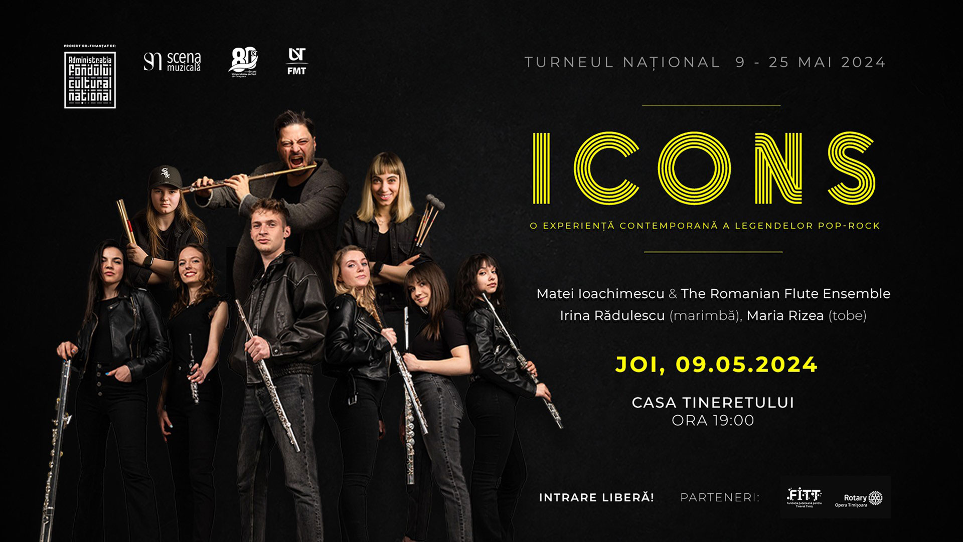 Matei Ioachimescu, unul dintre cei mai virtuozi flautiști ai momentului, conferențiar universitar în cadrul Facultății de Muzică și Teatru a Universității de Vest din Timișoara (UVT), pregătește turneul național ICONS, care se va desfășura în perioada 9 – 25 mai 2024. El invită publicul din nouă orașe (Timișoara, Sibiu, Cluj Napoca, Bistrița, Baia Mare, Brașov, Buzău, Ploiești și București) să participe la un spectacol palpitant, ce promite să redefinească experiența unui concert obișnuit.