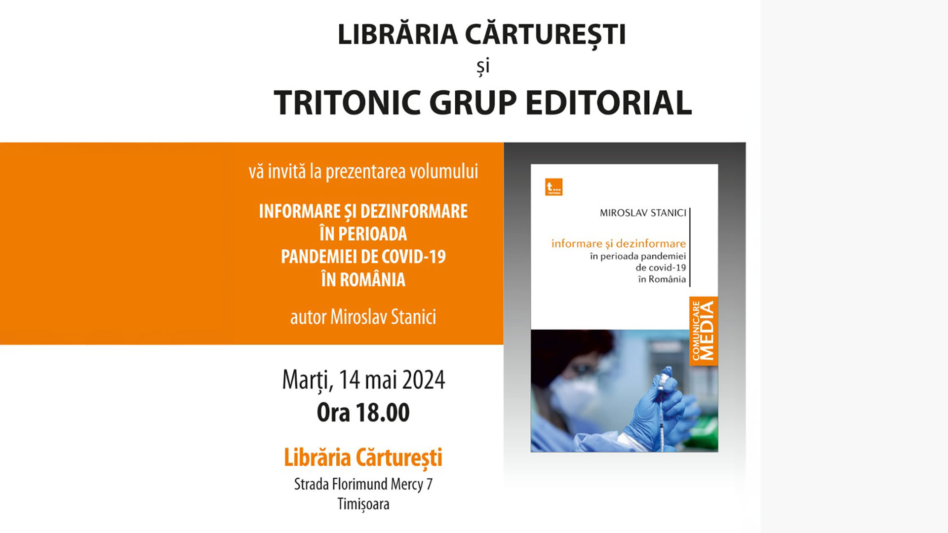 Marți, 14 mai 2024, ora 18:00, la Librăria Cărturești (Mercy) Timișoara vă invităm la lansarea volumului „Informare și dezinformare în perioada pandemiei de COVID-19 în România”, un studiu amplu bazat pe 40 de interviuri cu medici din prima linie care au luptat împotriva virusului SARS-CoV-2. Lucrarea analizează, de asemenea, discursul politic al demnitarilor (prim-miniștri, miniștri, președinți de consilii județene, primari de mari și mici orașe) care au gestionat criza sanitară din țară.