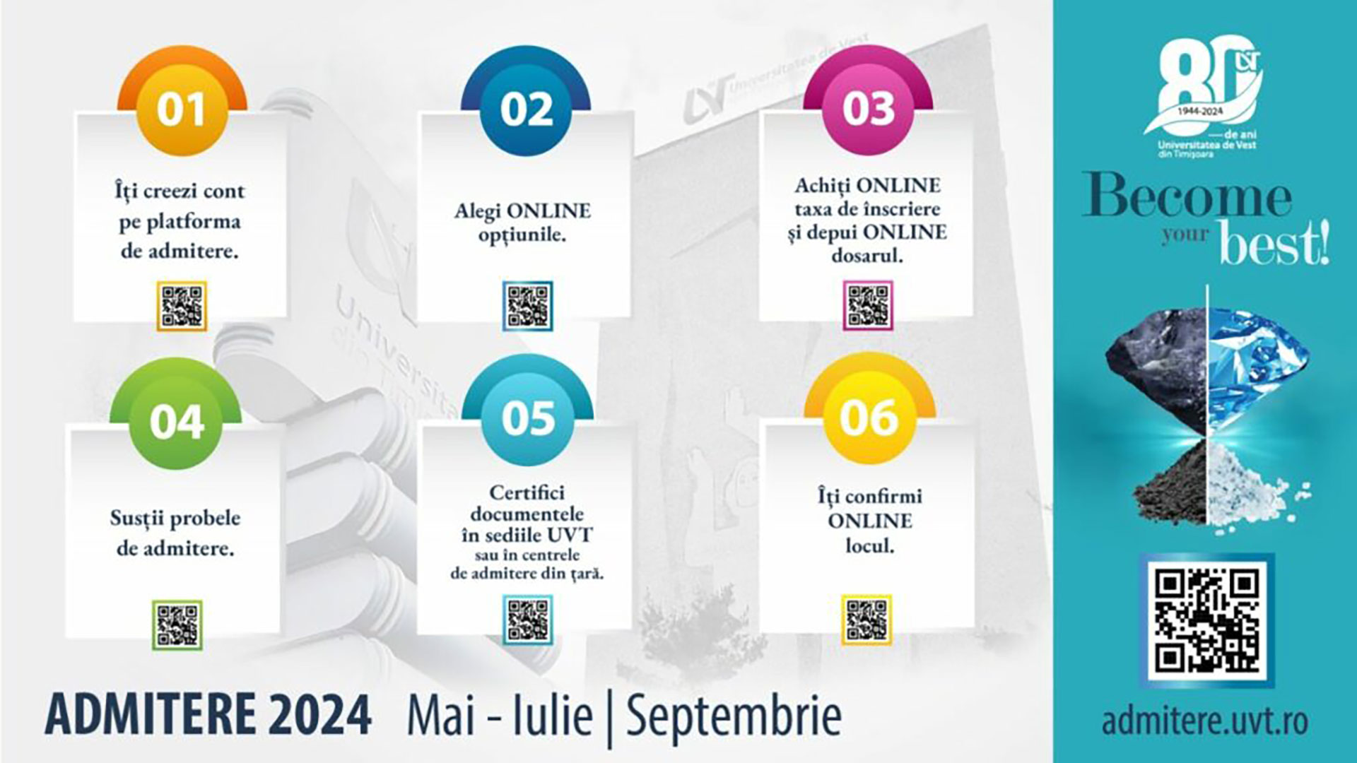 Toate informațiile despre procesul de admitere și oportunitățile pe care UVT le oferă sunt disponibile pe site-ul UVT dedicat procesului de admitere – admitere.uvt.ro.