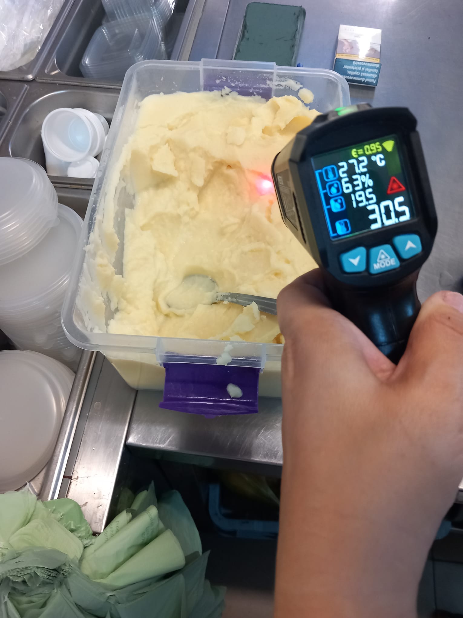 - nerespectarea regimului de temperatură pentru păstrarea preparatelor culinare calde (mâncăruri gătite) și reci (sosuri) (minim 60 grade Celsius pentru mâncarea caldă respectiv maxim 8 grade Celsius pentru sosuri)