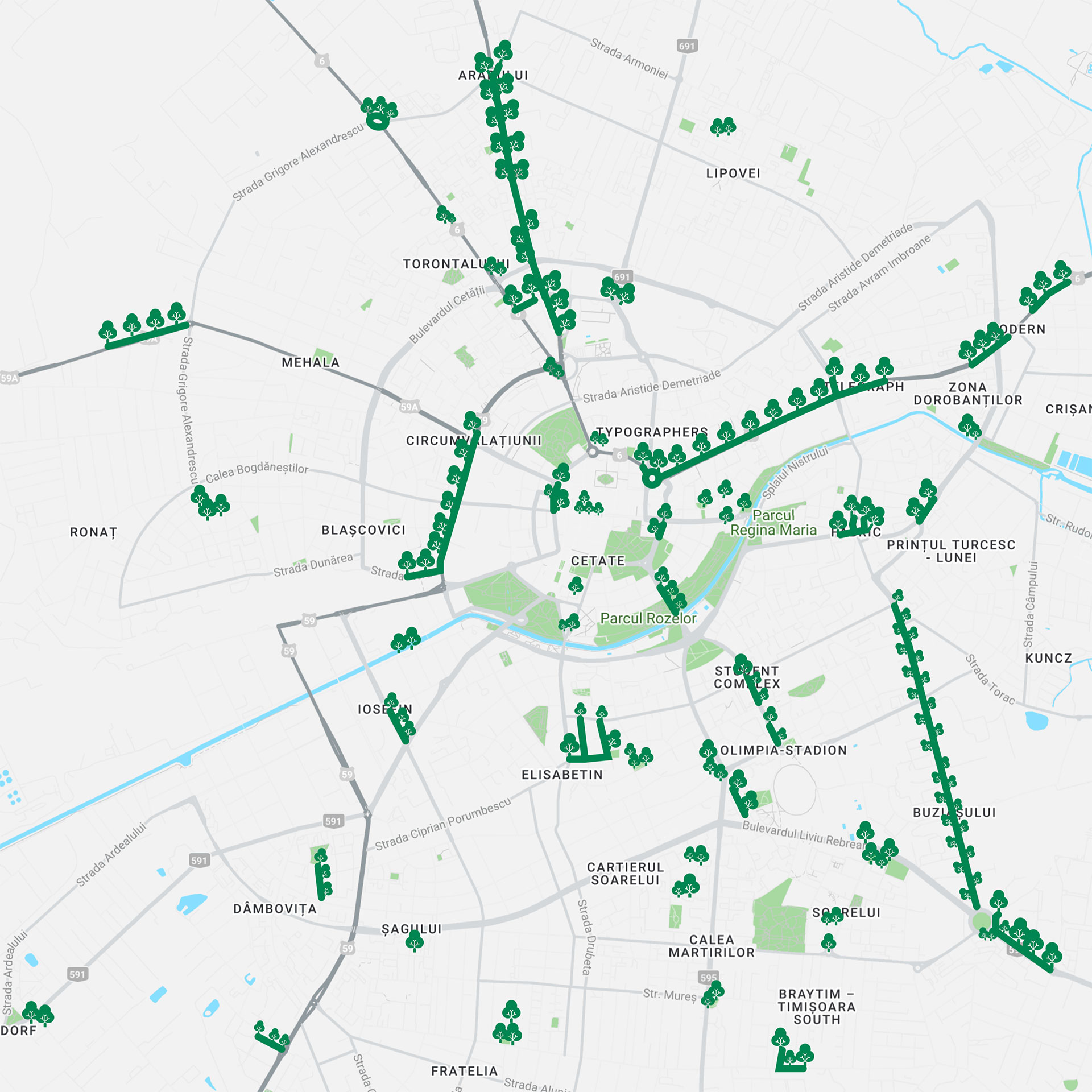 În campania de înverzire au fost incluse: bulevardele Take Ionescu – Simion Bărnuțiu –Calea Lugojului, str. Baba Dochia și intersecția Pestalozzi – Ștefan cel Mare, Calea Buziașului, Calea Stan Vidrighin, str. Arieș, F.C. Ripensia, str. Michelangelo, blvd. I.C. Brătianu, blvd. Regele Ferdinand, blvd. General I. Dragalina, str. Gheorghe Dima, Calea Circumvalațiunii, str. Ovidiu Balea, Calea Torontalului, Calea Aradului și blvd. Antenei. Alte locații unde Primăria a efectuat plantări sunt: Piața Crucii, Parcul Triade, zona Semicerc, scuarul de la intersecția Sudului cu Rebreanu, scuarul de pe Mihail Kogălniceanu și Piața Libertății.