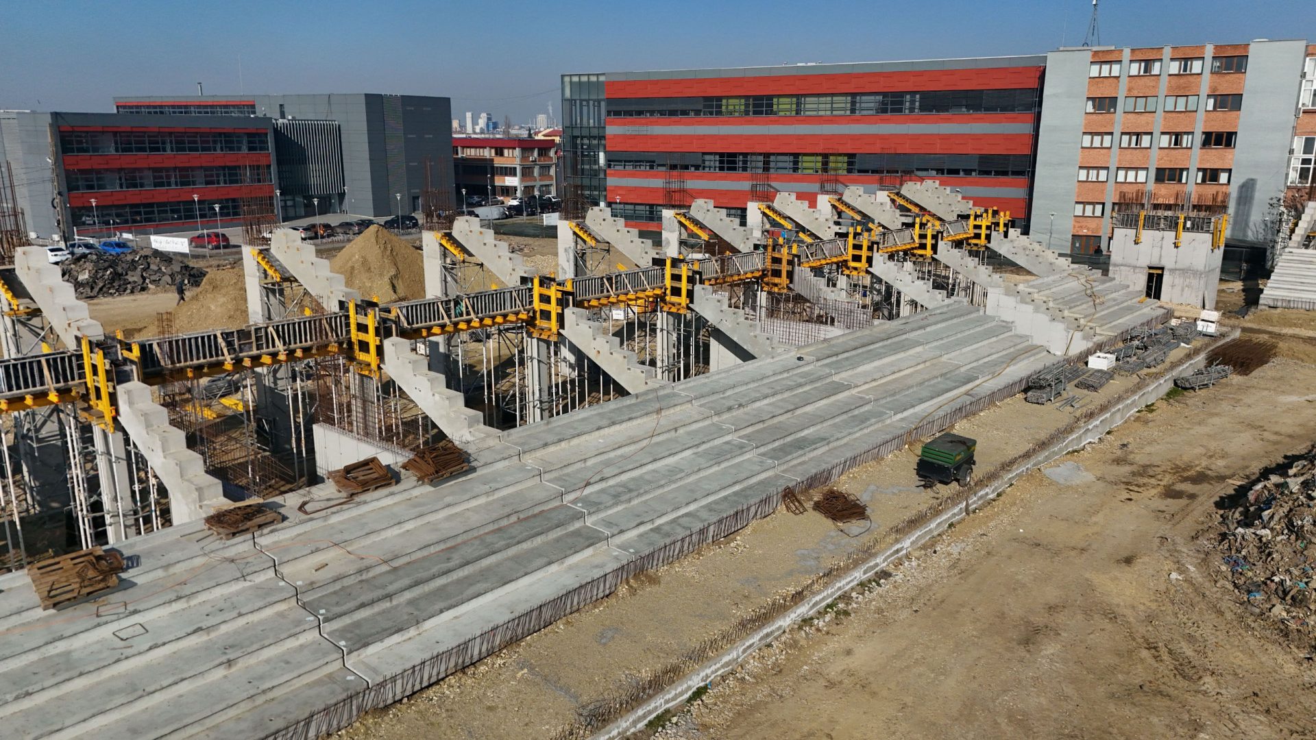 Până în prezent, constructorul a terminat de montat grinzile prefabricate pentru gradene la Tribuna Sud, la Peluza Vest, în proporție de 90% din grinzi la Peluza Est și 50% la Tribuna Nord. Acesta a finalizat și cofrarea și turnarea stâlpilor monoliți pentru Peluza Est.