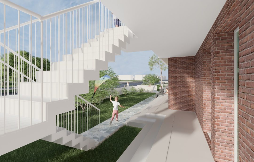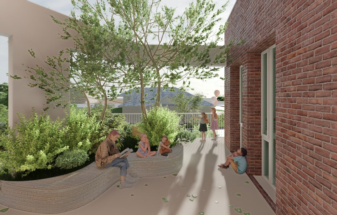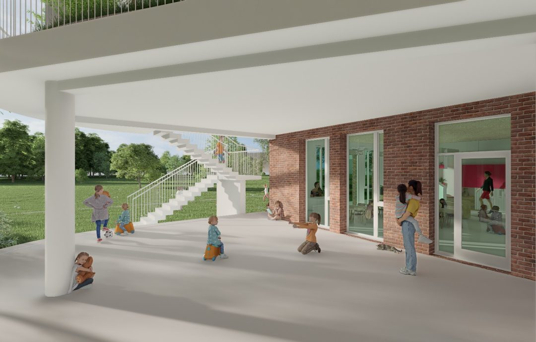 La parter se mai află spațiul de luat masa, un spațiu deschis ce face tranziția între interior și exterior, în strânsă legătură cu spațiul multifuncțional, și cabinetul medical. Terasele clădirii sunt de jur împrejur creând un sistem de curți de joacă, fiind amplasate atât la parter cât și la etaj.
