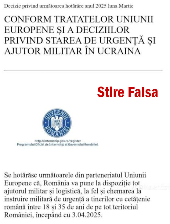 Una dintre dezinformări susține că, începând cu 3 aprilie 2025, tinerii români cu vârste între 18 și 35 de ani vor fi chemați de urgență la instruire militară. Ministerul reamintește că serviciul militar obligatoriu a fost suspendat în România pe timp de pace încă din 1 ianuarie 2007, conform Legii 395/2005. De asemenea, MApN a declarat în repetate rânduri că nu ia în calcul reintroducerea acestuia, ci urmărește recrutarea rezerviștilor exclusiv pe bază de voluntariat.