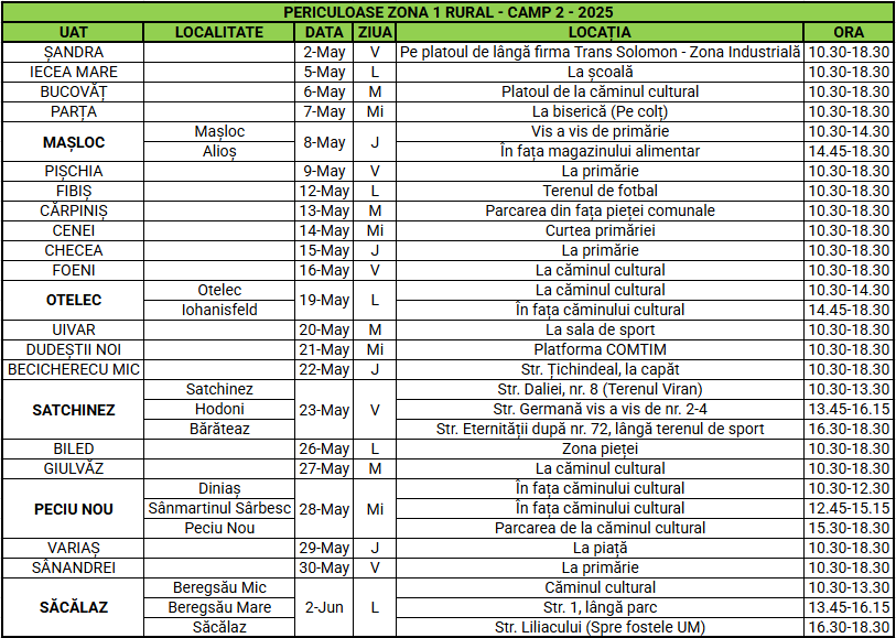 Cetățenii din localitățile menționate mai sus pot preda gratuit prin aport voluntar deșeurile periculoase din menajer în containerele special amplasate la punctele de colectare, în intervalul orar specificat în tabelul de mai jos.