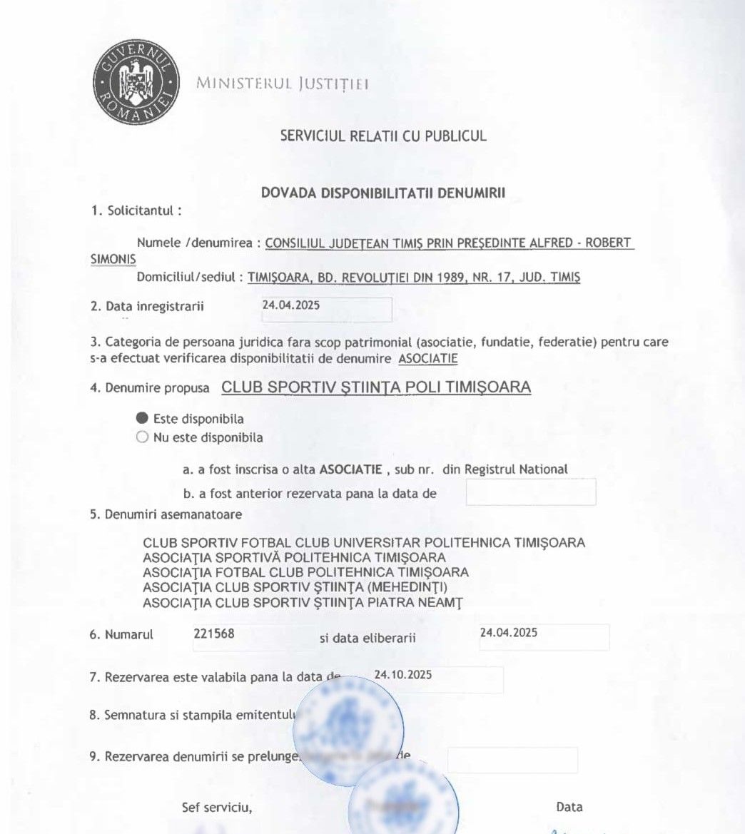 Președintele Consiliului Judetean Timiș, social-democratul Alfred Simonis, a anunțat numele viitoarei echipe fanion a orașului, echipă care va deține palmaresul Politehnicii Timișoara: Clubul Sportiv Știința Politehnica Timișoara. Numele echipei a fost aprobat de Ministerul Justiției și actele înființării vor fi depuse în zilele viitoare la Tribunalul Timiș