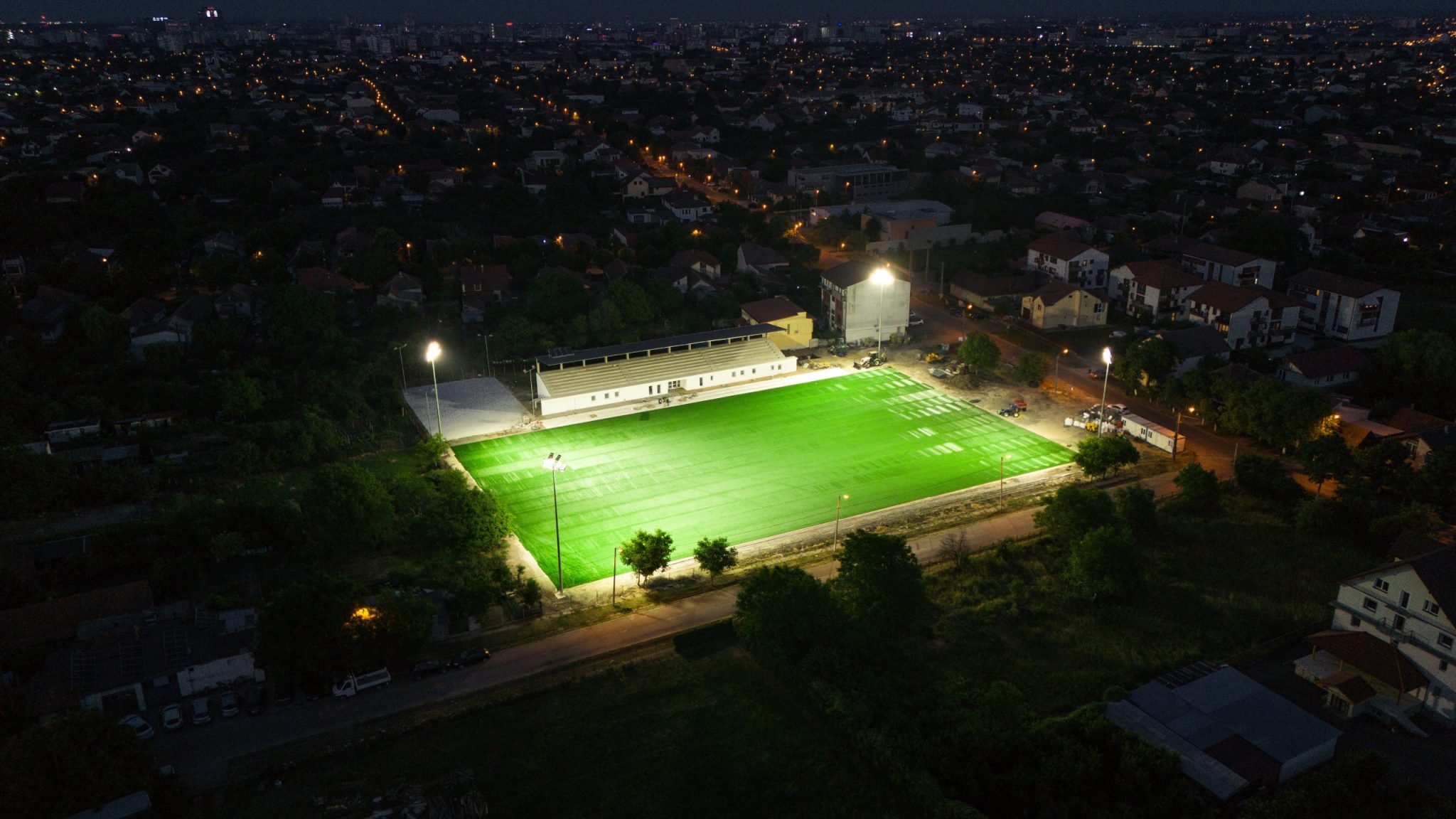 Lucrările au avansat vizibil: gazonul a fost montat, instalația de nocturnă este deja funcțională, iar în scurt timp vor fi trasate marcajele de joc. Pe lângă terenul principal, se lucrează și la finalizarea clădirii administrative, a fațadei, a vestiarelor și a tribunei cu 417 locuri.